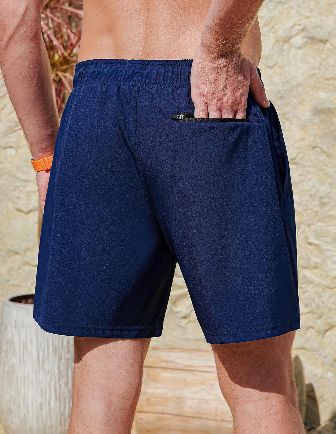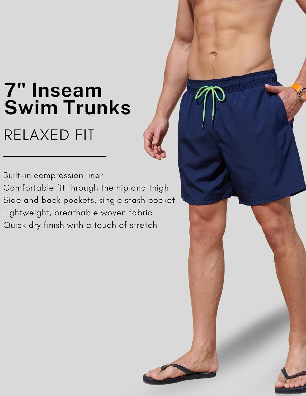 2 Pack: Men’s 7″ Swim Trunks with Compression Liner, Quick Dry Stretch Swimming Shorts Bathing Suits Swimwear(Blue/Navy)