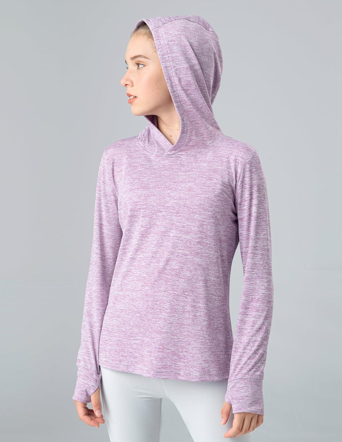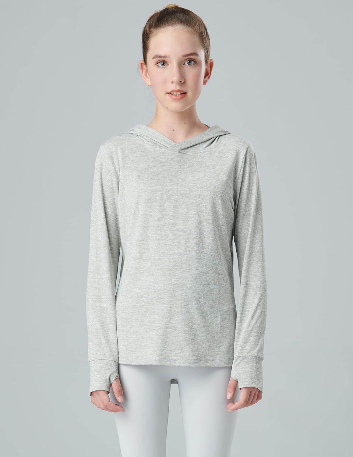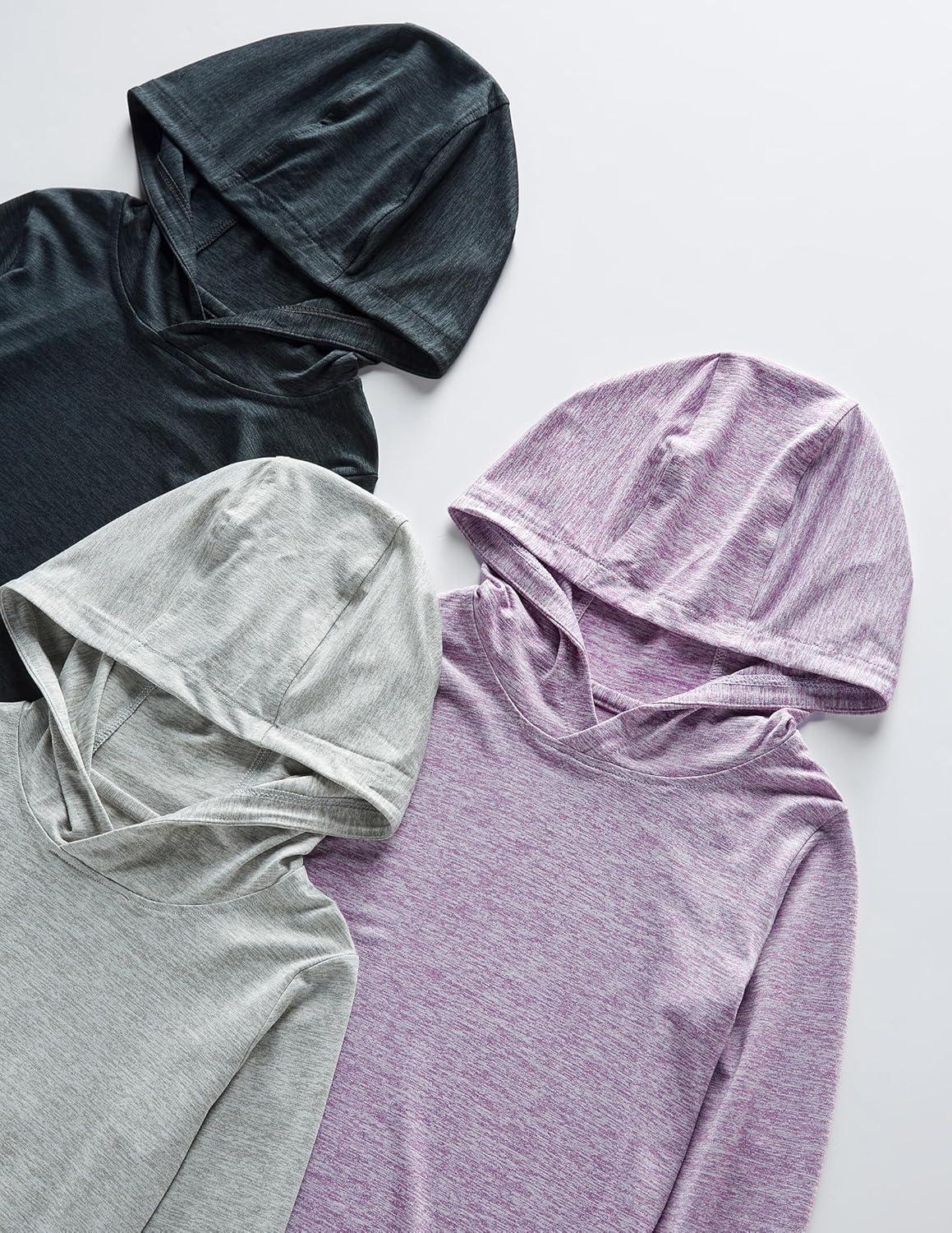 3 Pack Athletic Girls Long Sleeve Shirts with Thumb Holes, Workout Hoodies for Kids, Hooded Shirt Pullover Tops(Black/Lavender/Gray)