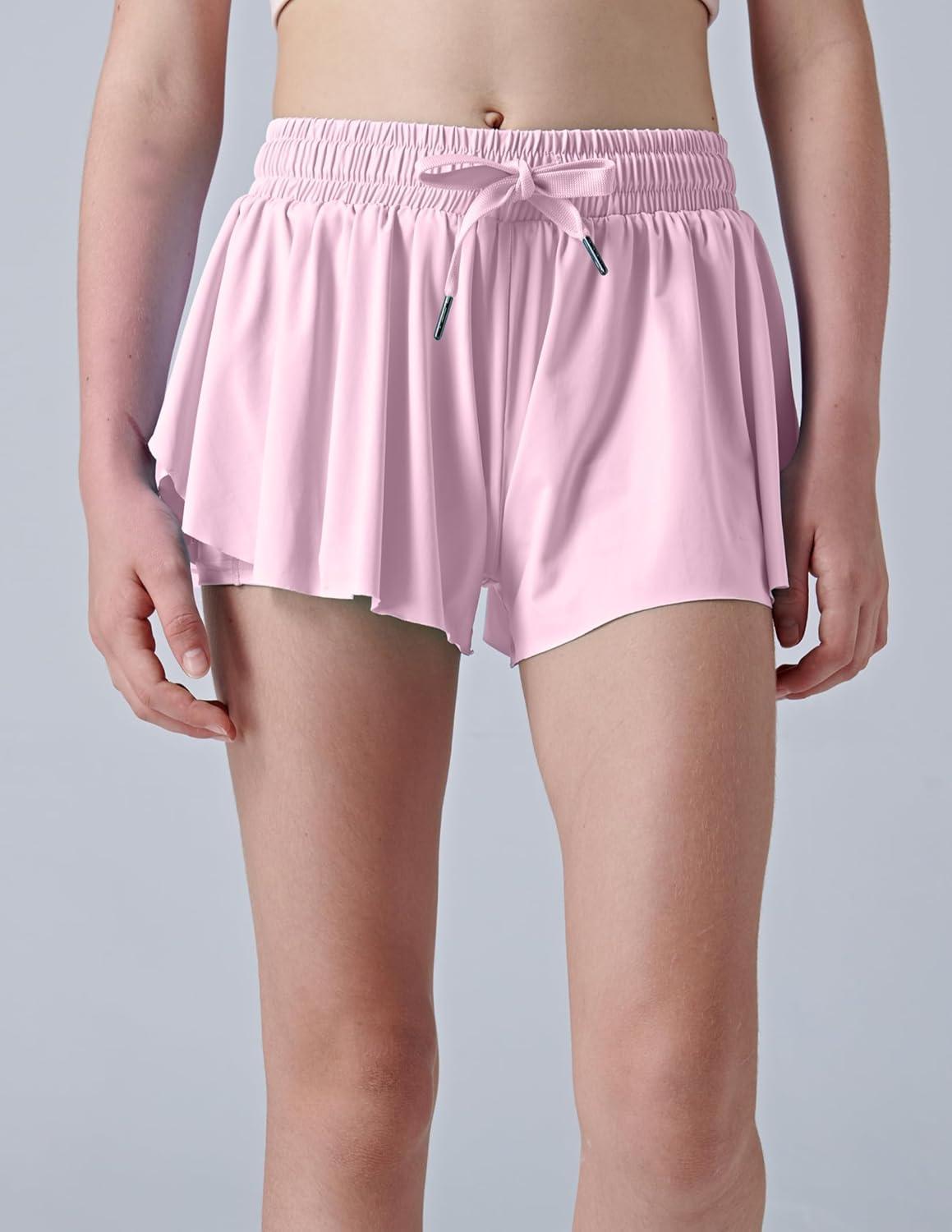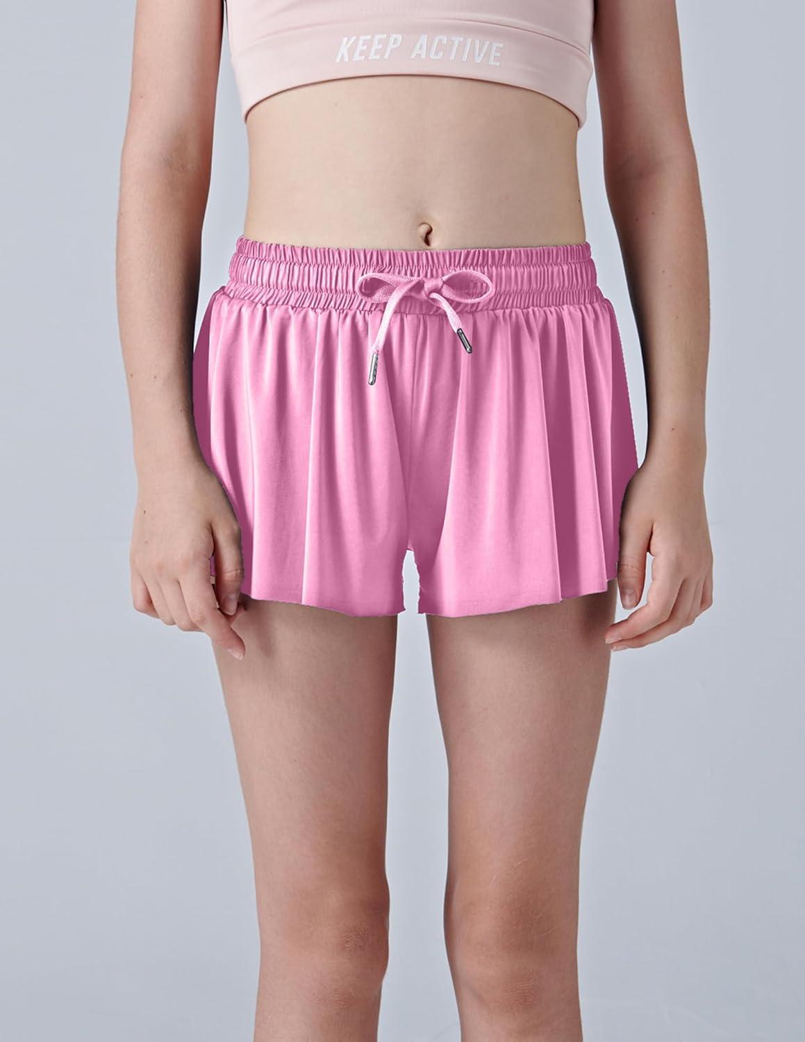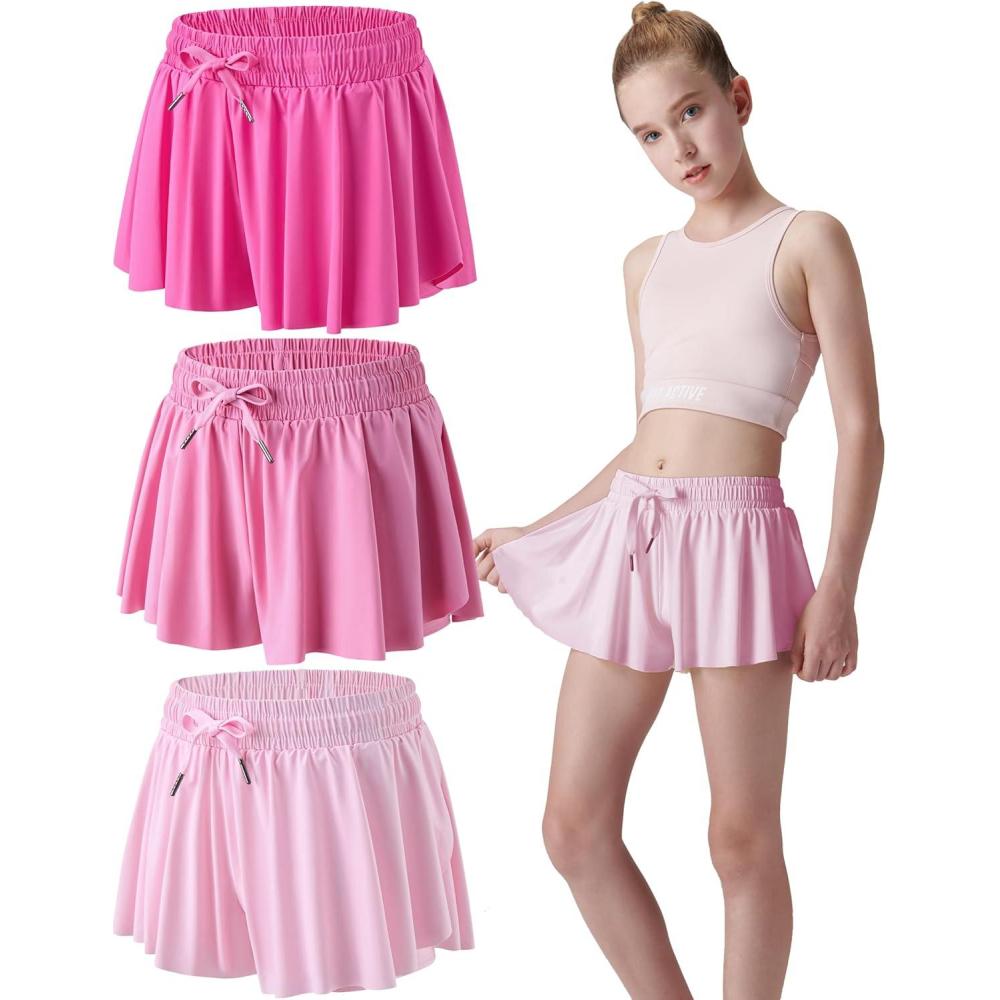 3 Pack Girls Flowy Shorts with Spandex Liner 2-in-1 Youth Butterfly Skirts for Fitness, Running, Sports(Light Pink/Pink/Hot Pink)