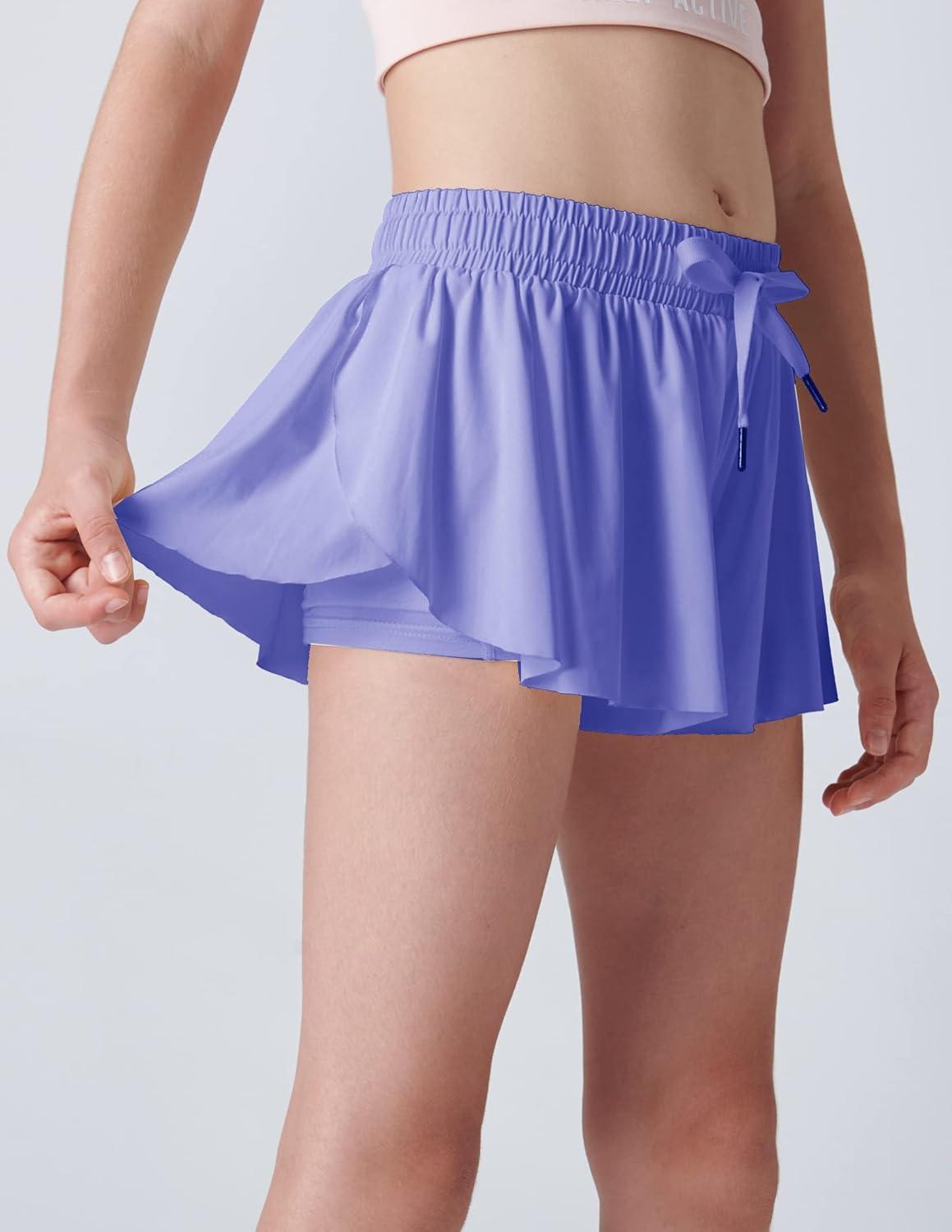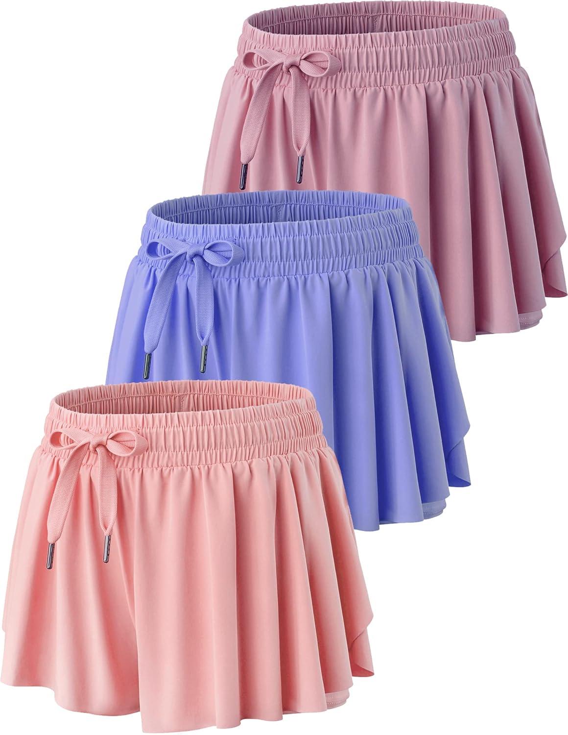 3 Pack Girls Flowy Shorts with Spandex Liner 2-in-1 Youth Butterfly Skirts for Fitness, Running, Sports(Peach/Periwinkle/Red Violet)