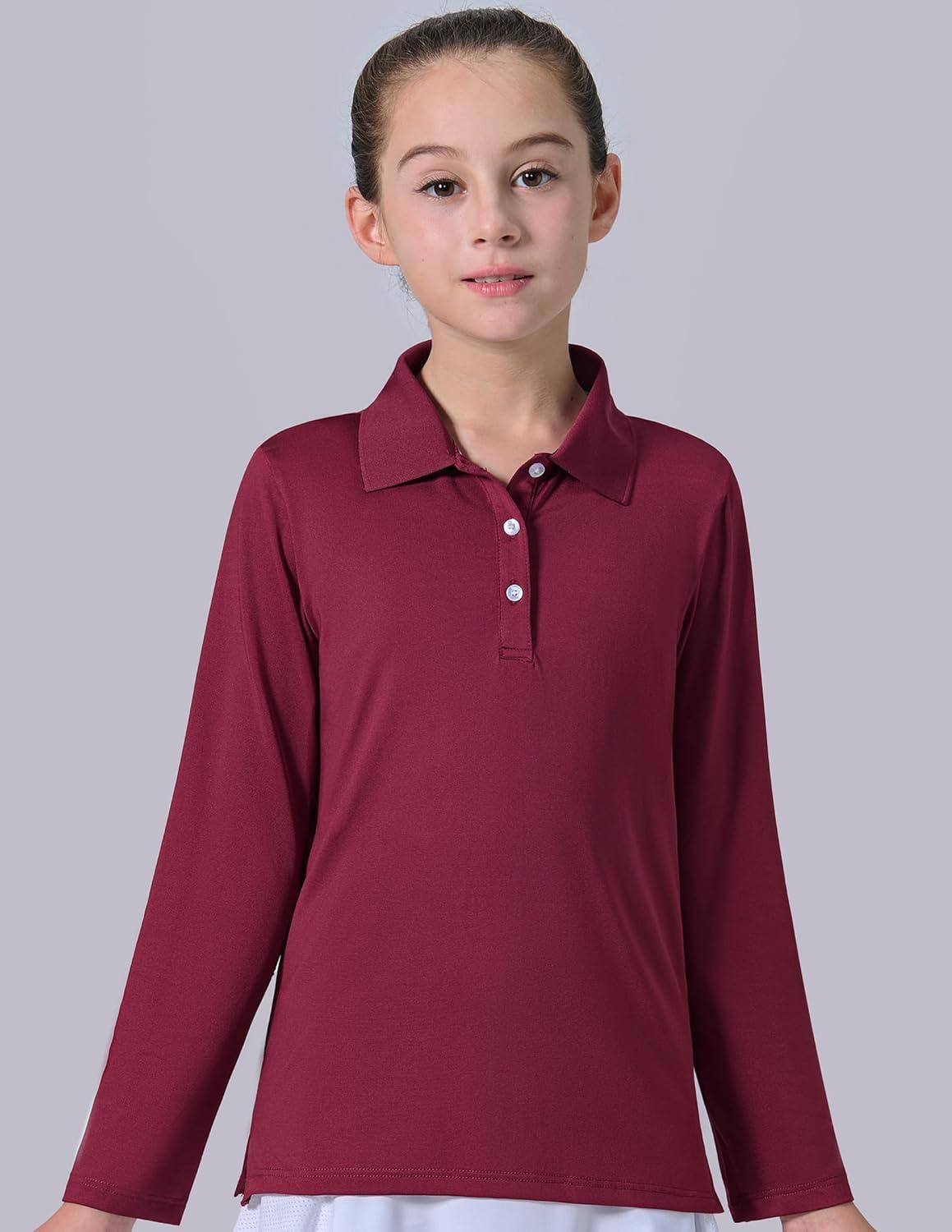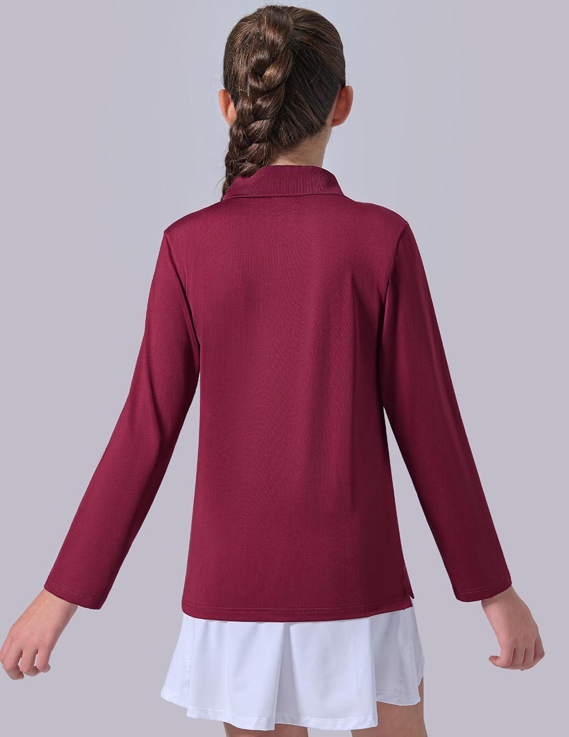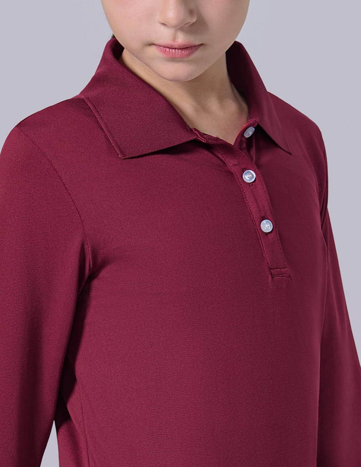 3 Pack Youth Girls’ Performance Polo Shirts, Long Sleeve Pique Collared Kids School Uniform Tops(Gray/Light Blue/Burgundy)