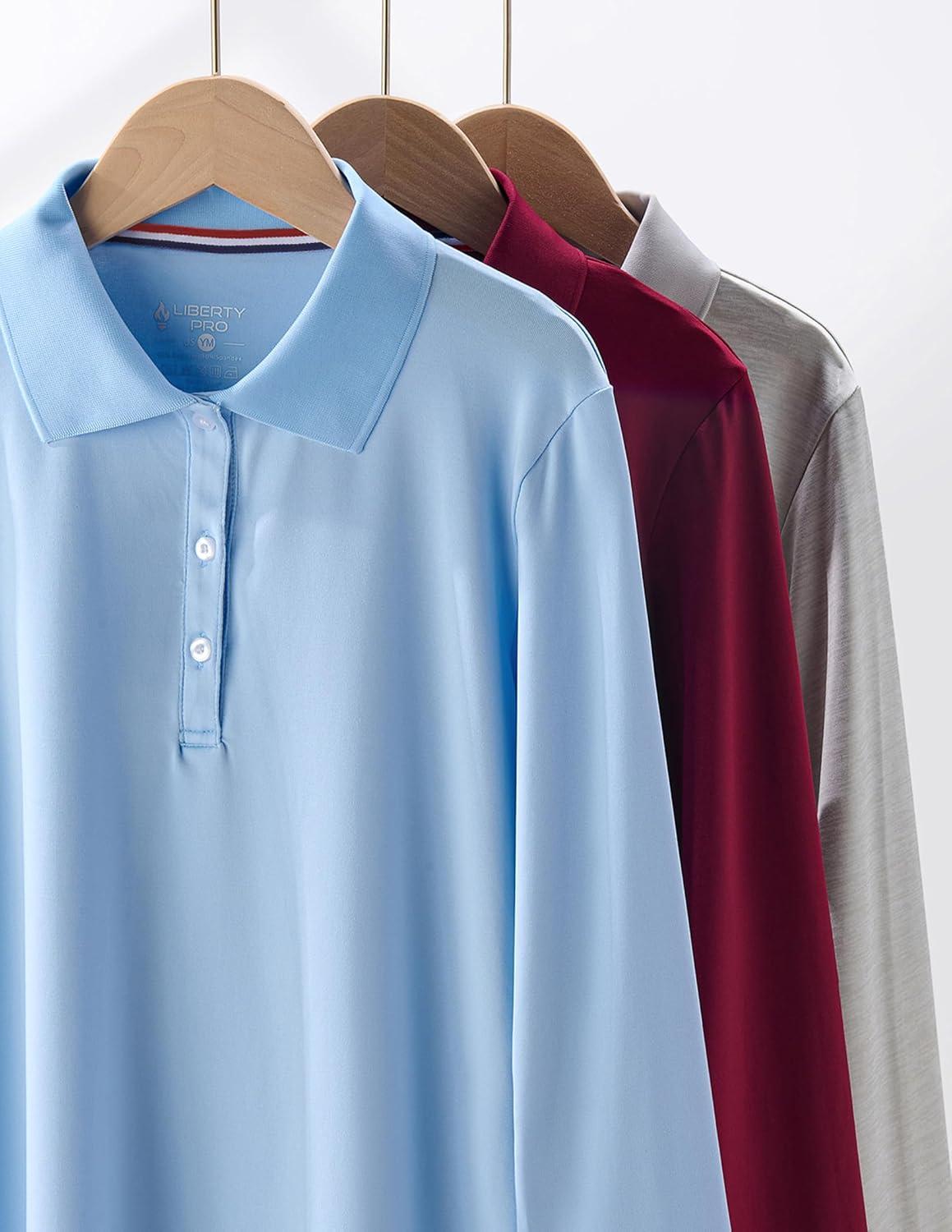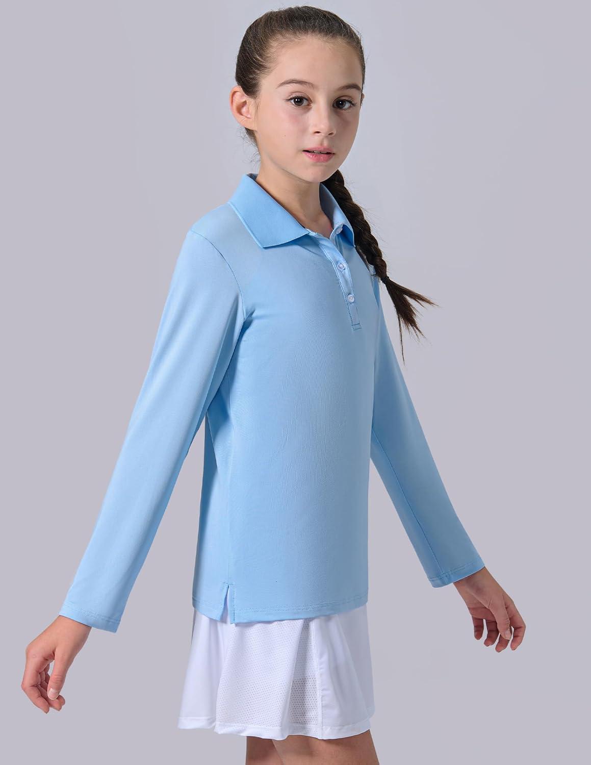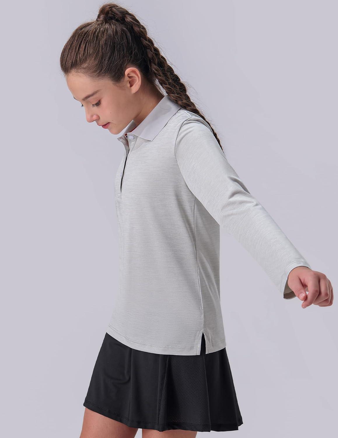 3 Pack Youth Girls’ Performance Polo Shirts, Long Sleeve Pique Collared Kids School Uniform Tops(Gray/Light Blue/Burgundy)