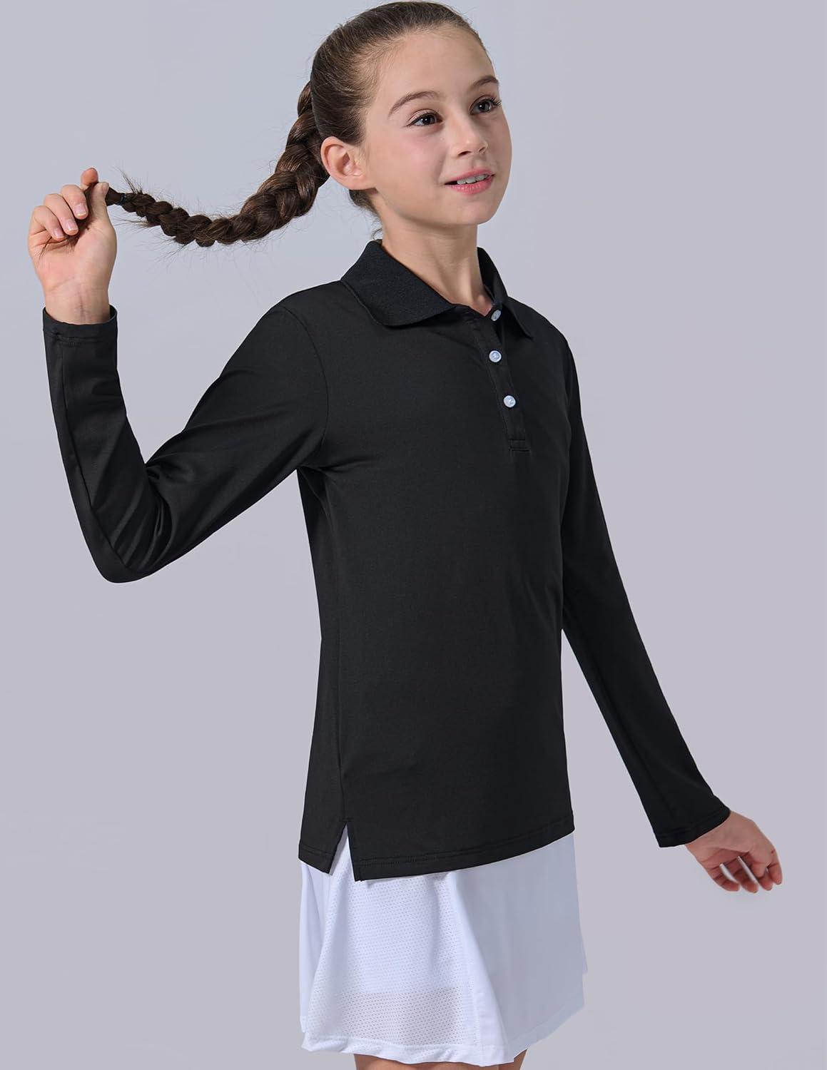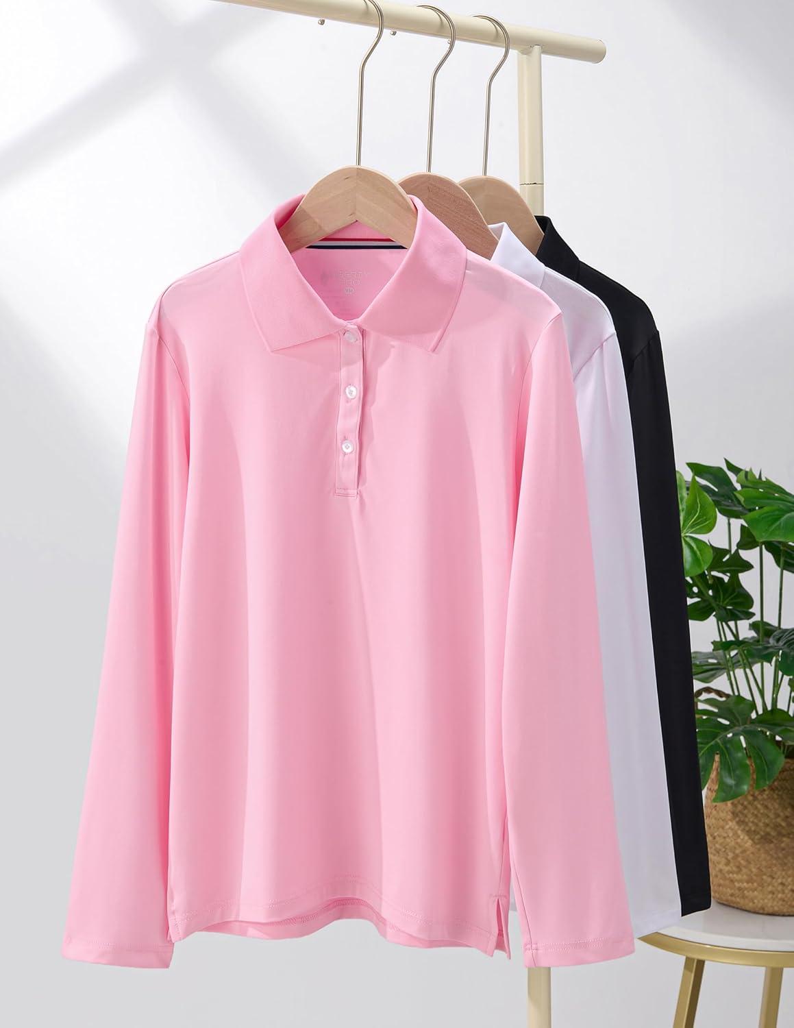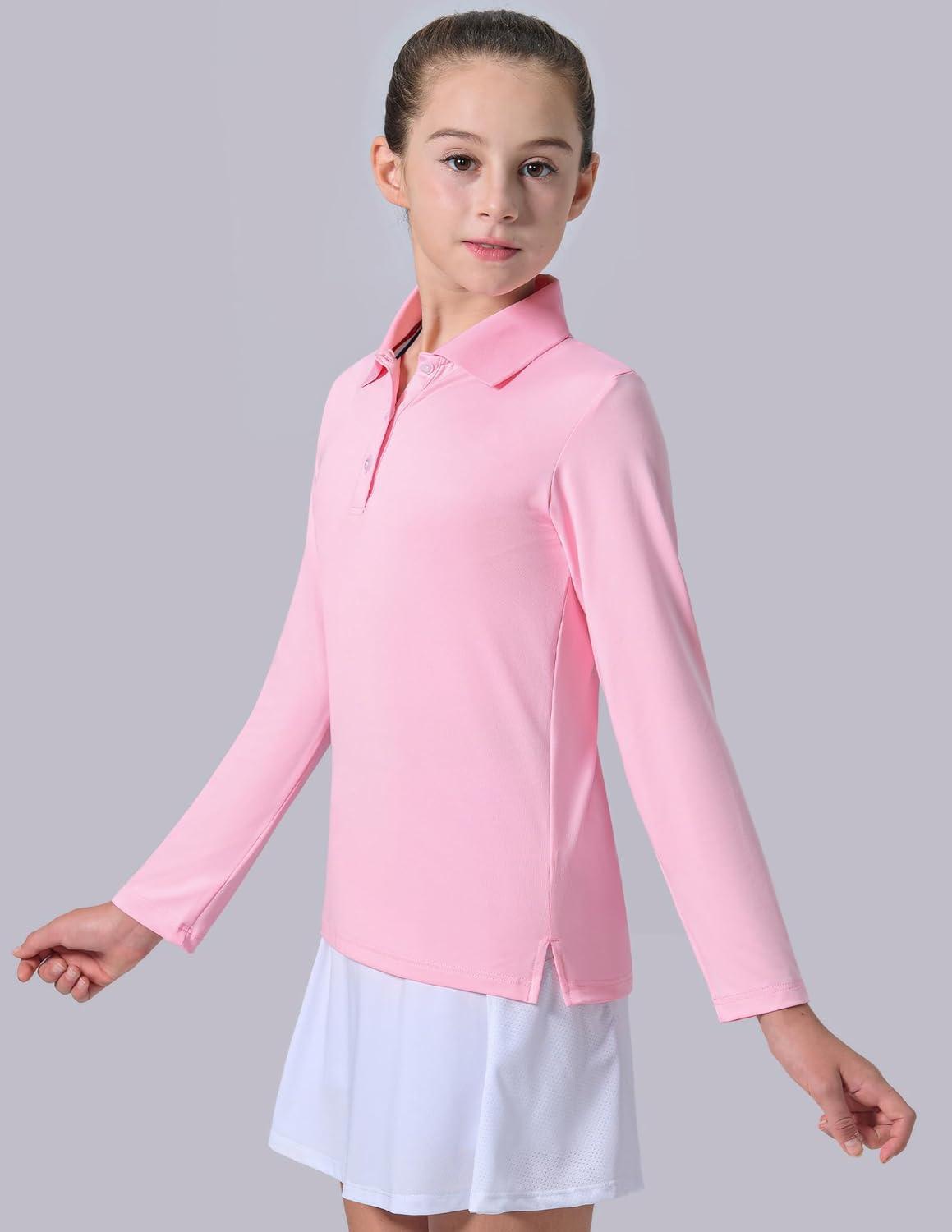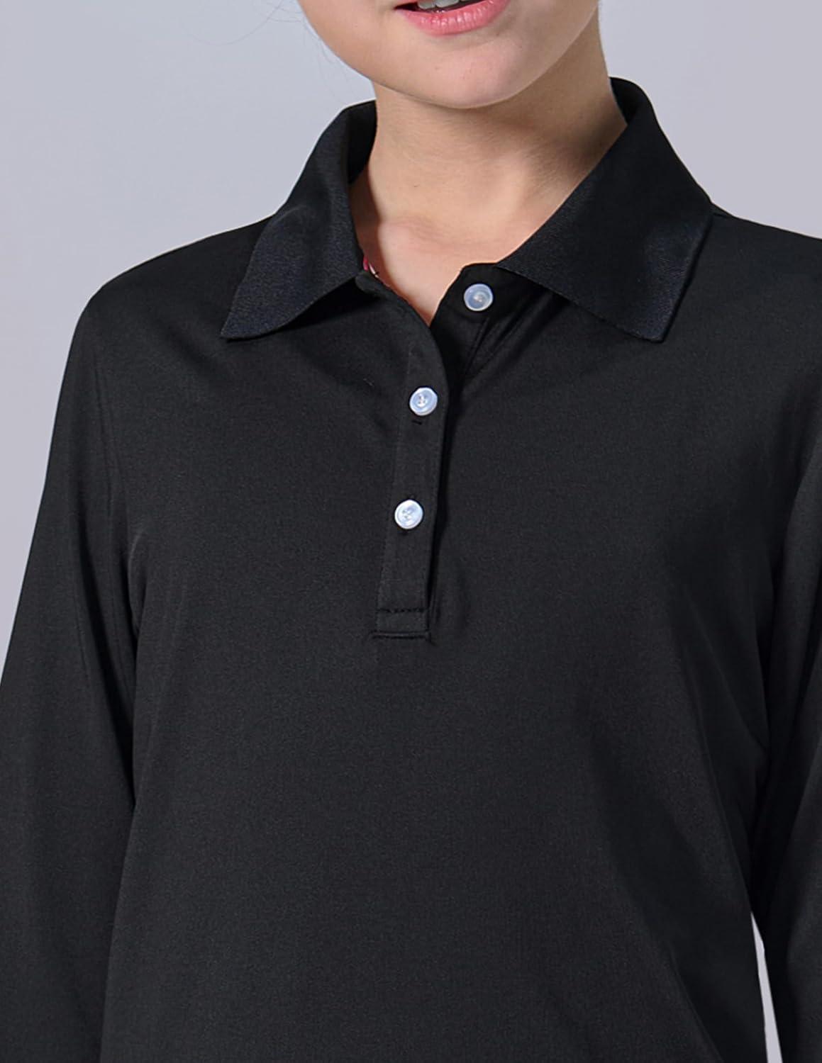 3 Pack Youth Girls’ Performance Polo Shirts, Long Sleeve Pique Collared Kids School Uniform Tops(Pink/Black/White)