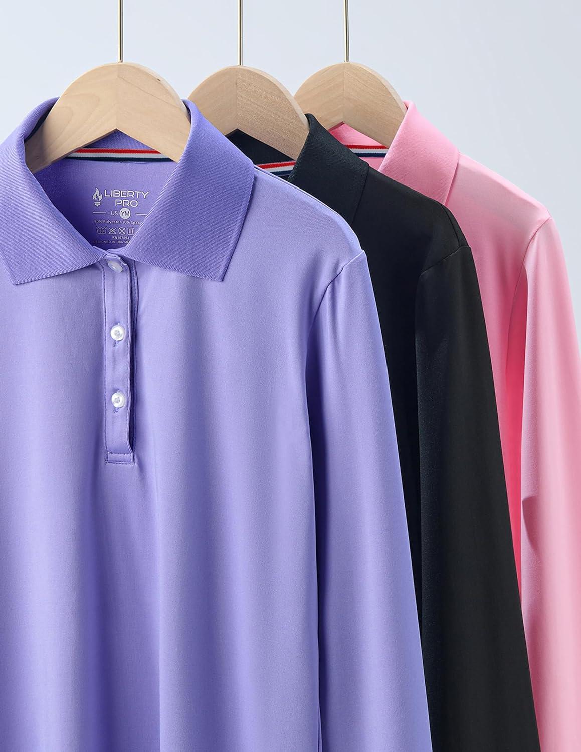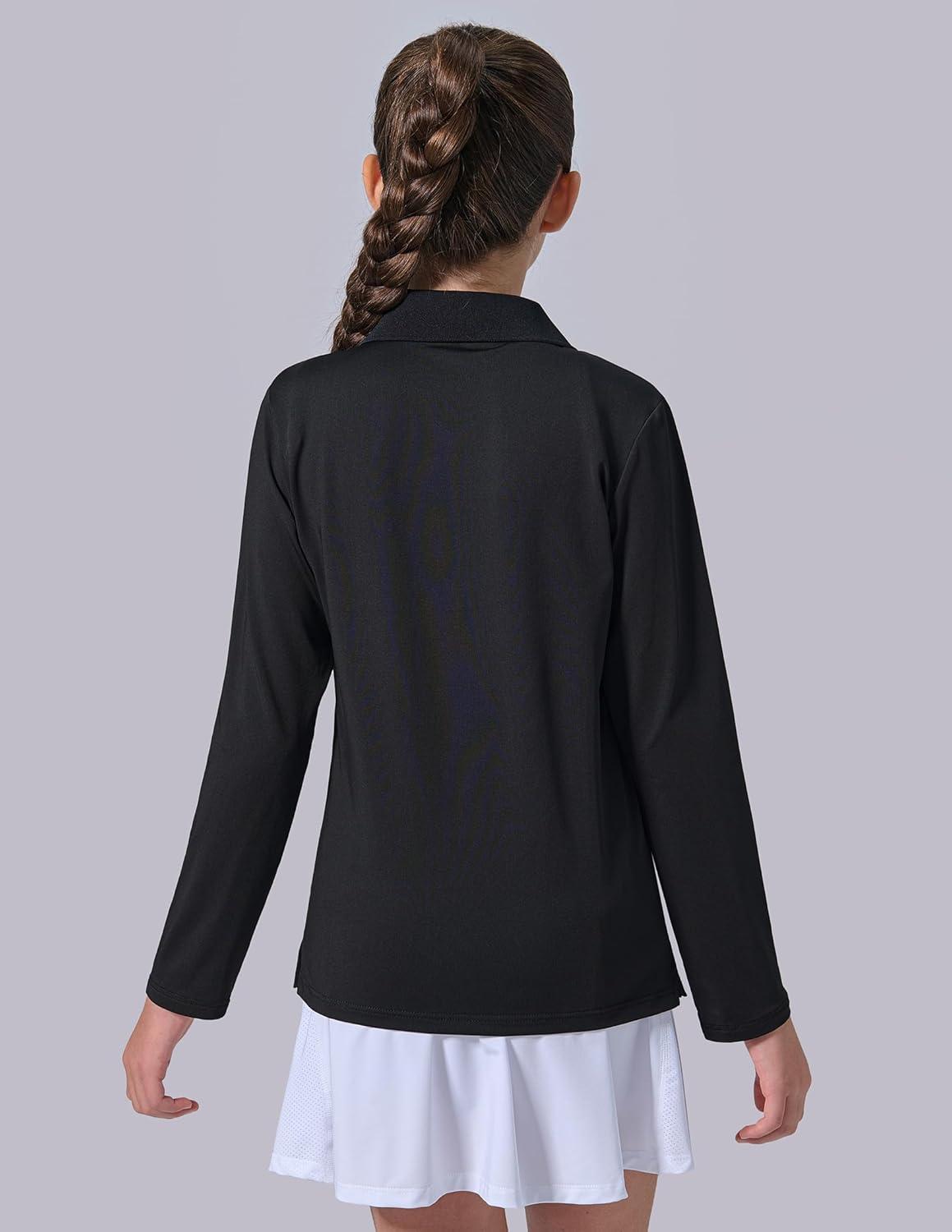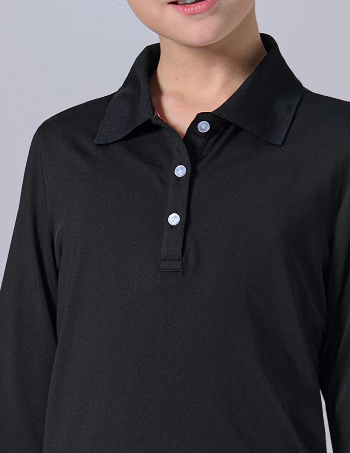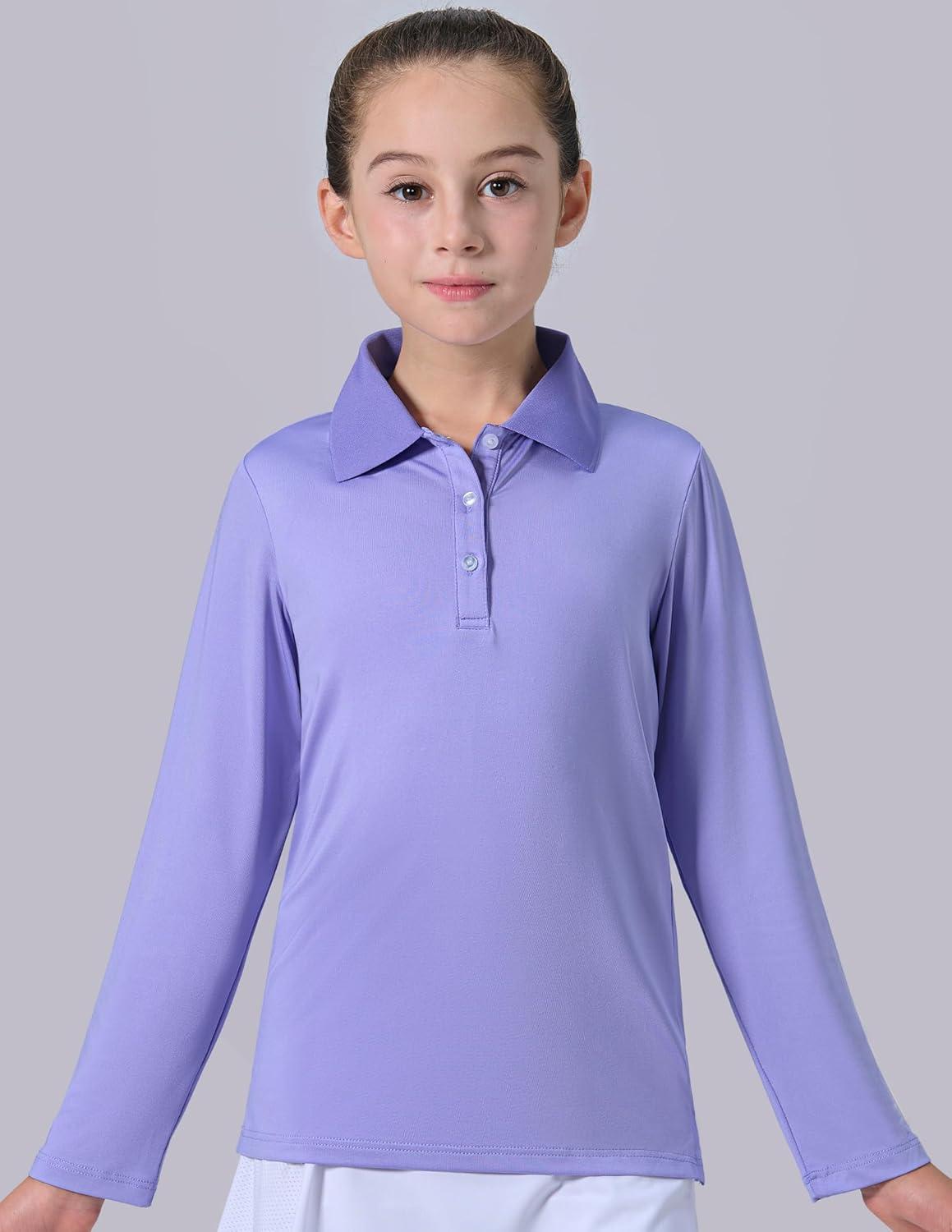 3 Pack Youth Girls’ Performance Polo Shirts, Long Sleeve Pique Collared Kids School Uniform Tops(Pink/Lilac/Black)