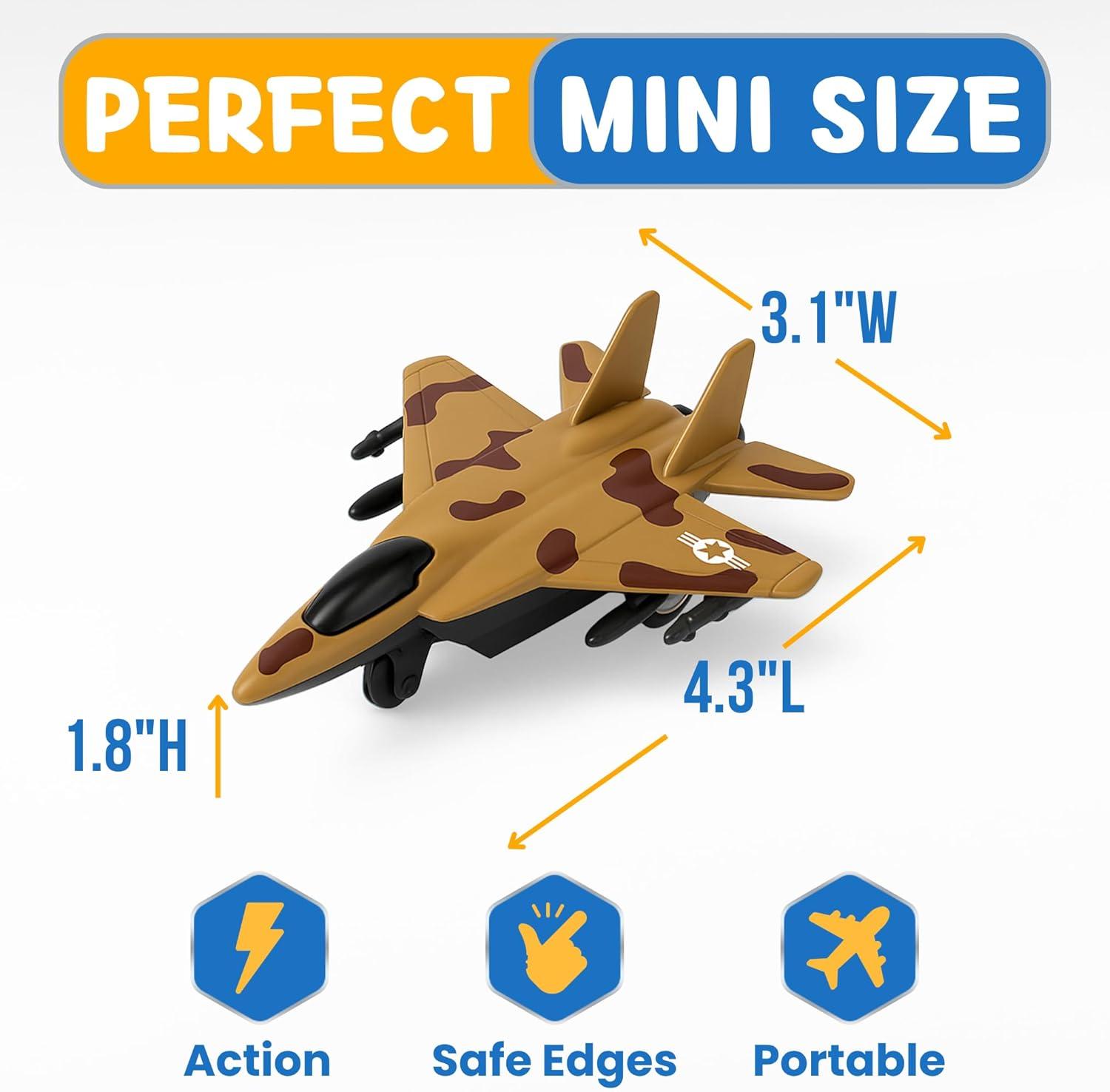 Miniature Size: These miniature fighter jets measure 4.5 inches long and 3 inches wide, making them perfect for little hands to play and carry around. The size also makes them suitable for indoor and outdoor play, with easy storage for on-the-go adventures