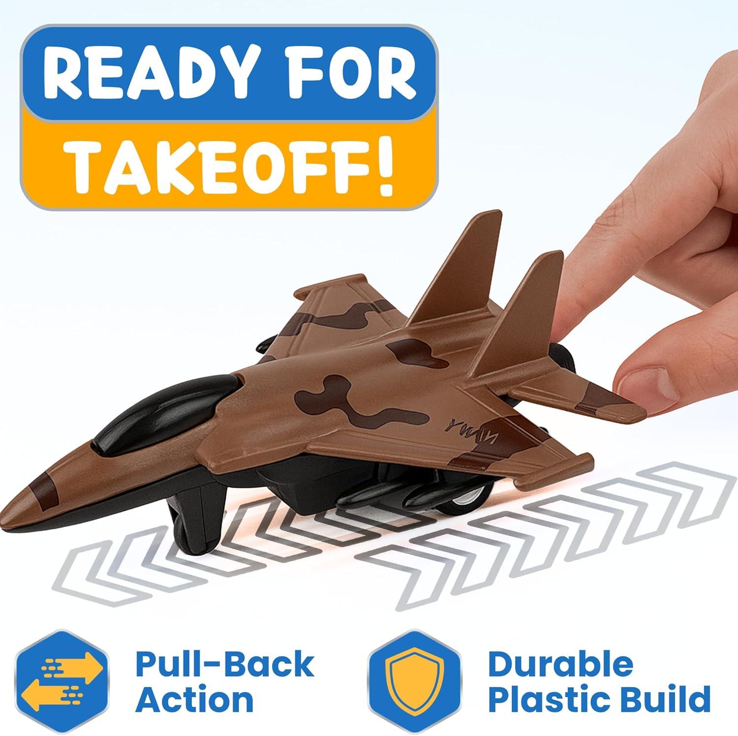 Pullback Action: With no batteries required, these pullback fighter jets are ready to take off in your child's hand. Simply pull back the toy and let it soar into the sky, adding excitement and fun to your child's playtime