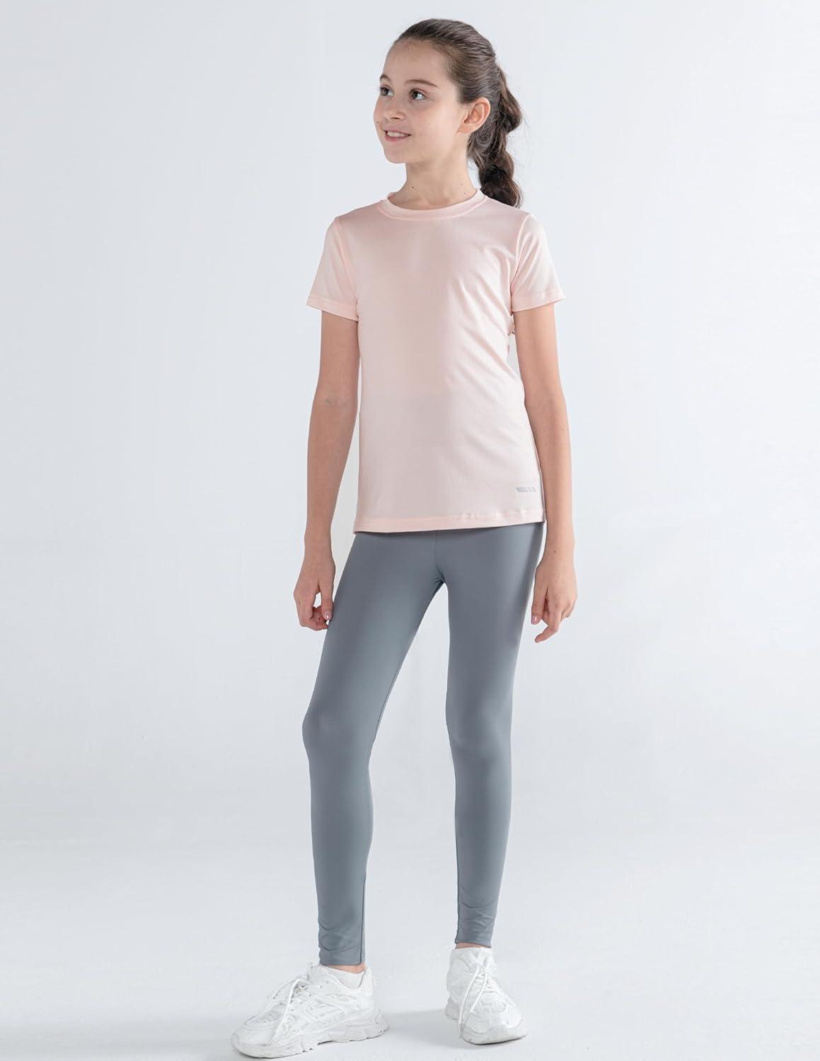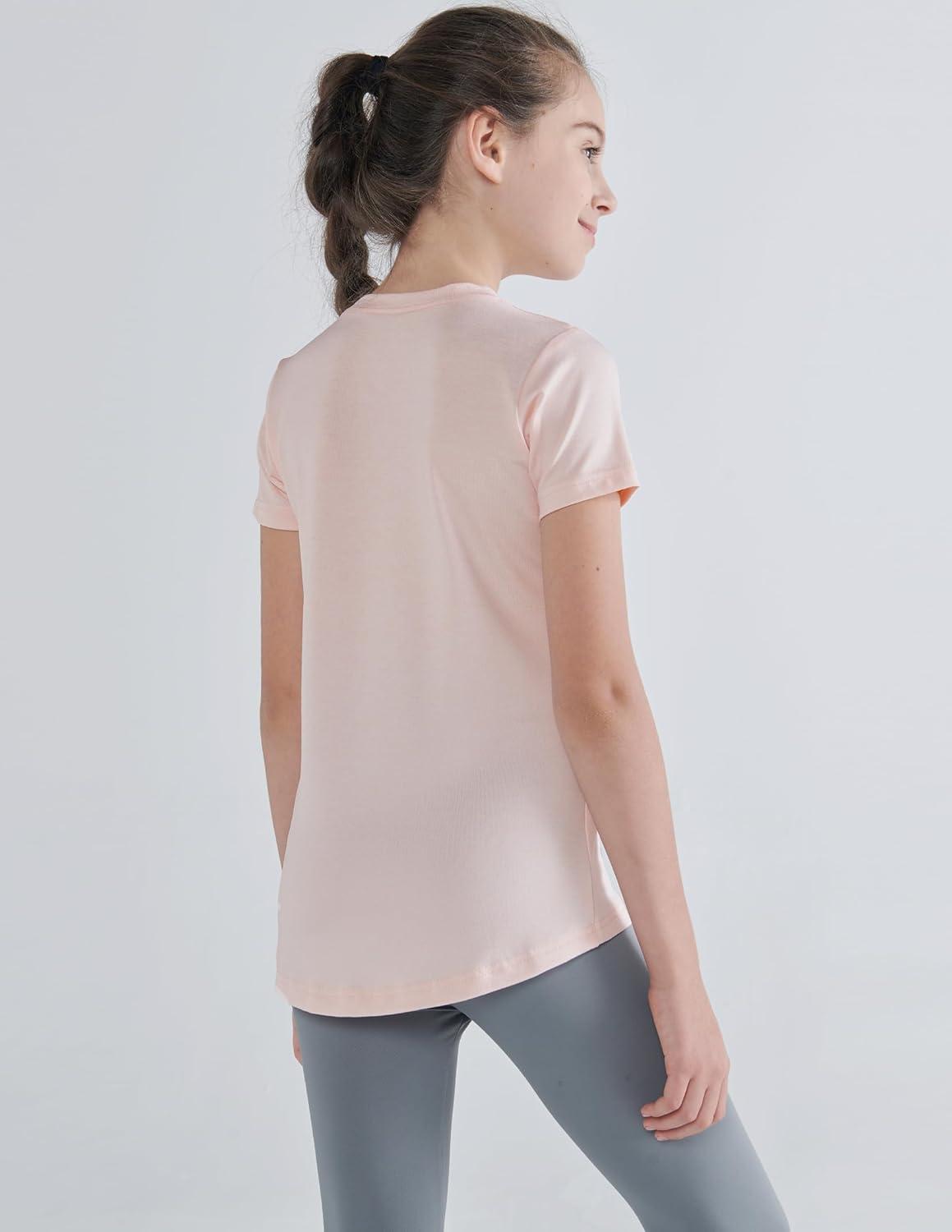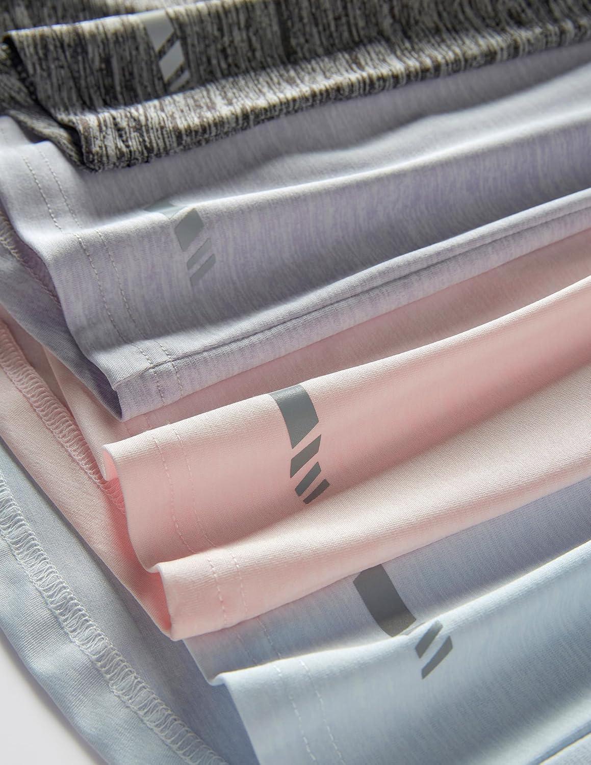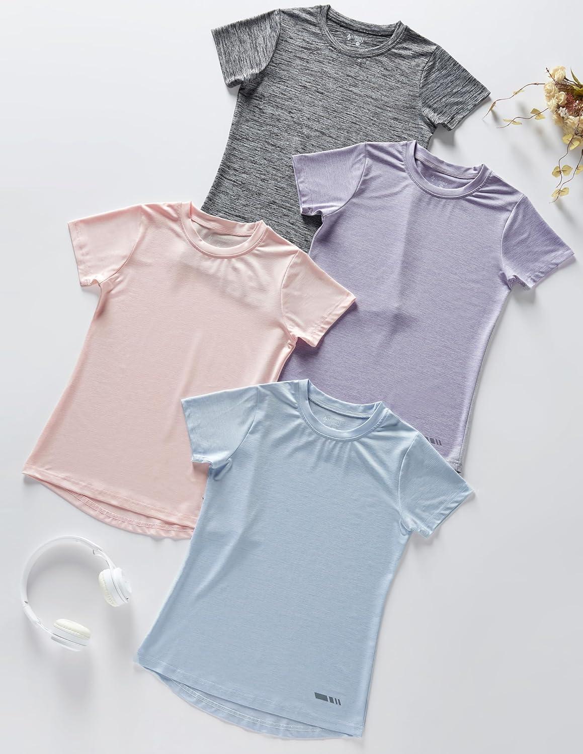 4 Pack: Youth Girls Athletic Shirts, Short Sleeve Dry Fit Apparel Tech Tshirts, Sports Activewear for Kids Teens(Heavenly Pink/Lavender Blue/Ancient Water/Metallic Silver)