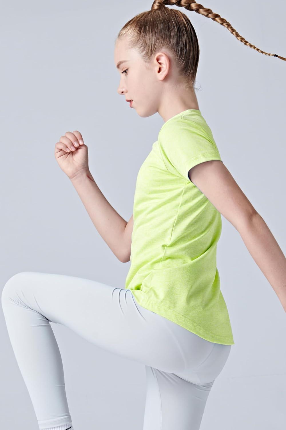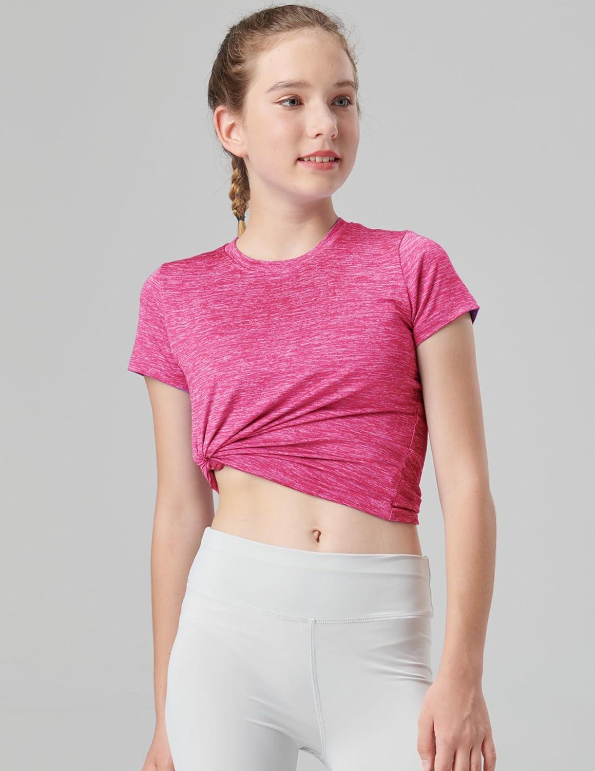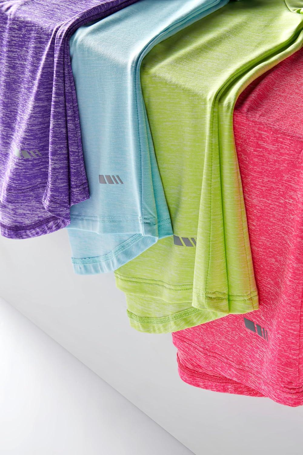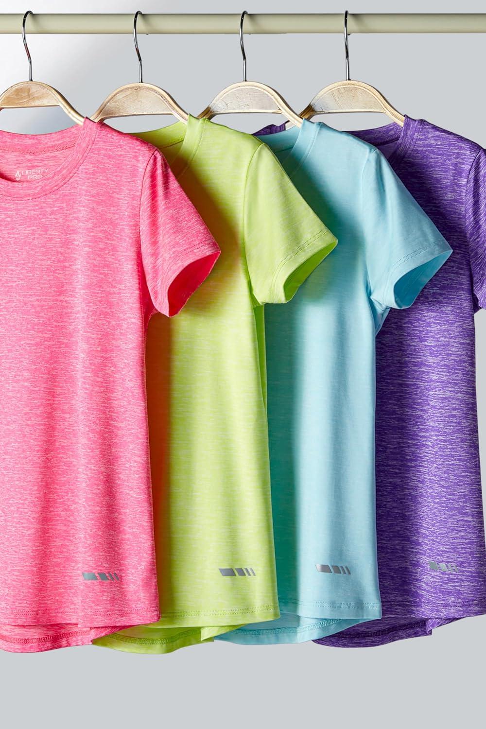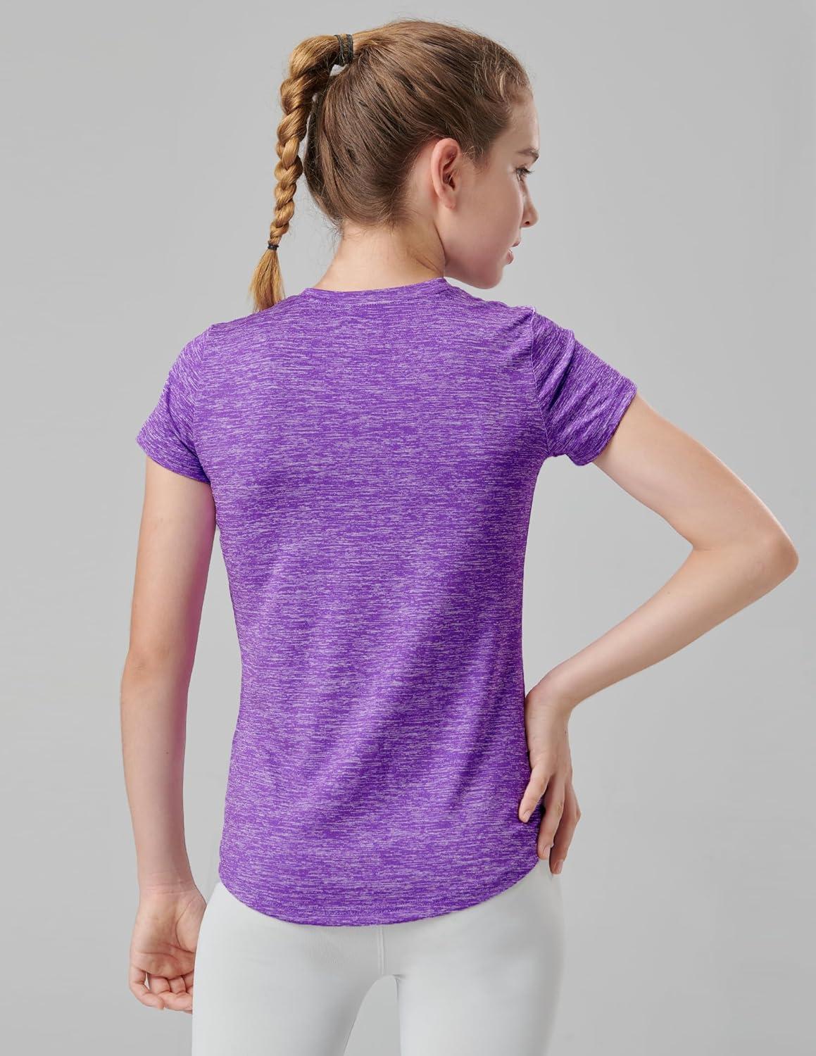 4 Pack: Youth Girls Athletic Shirts, Short Sleeve Dry Fit Apparel Tech Tshirts, Sports Activewear for Kids Teens(Purple/Baby Blue/Hot Pink/Neon Yellow)