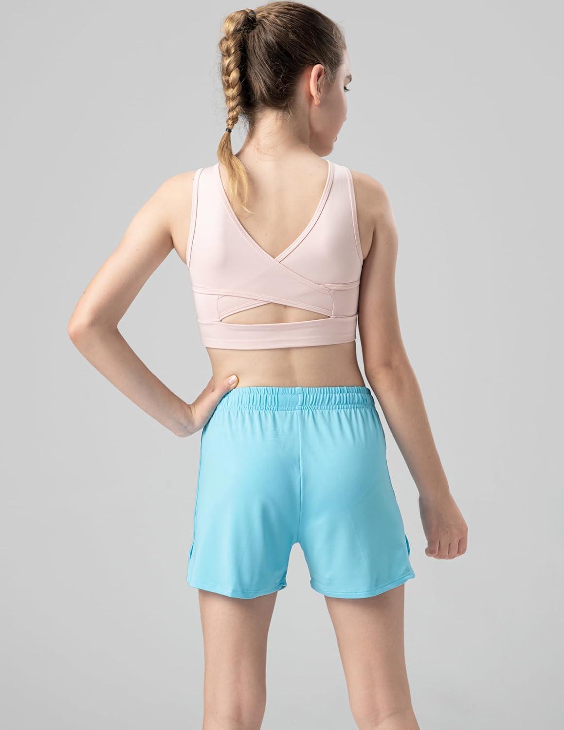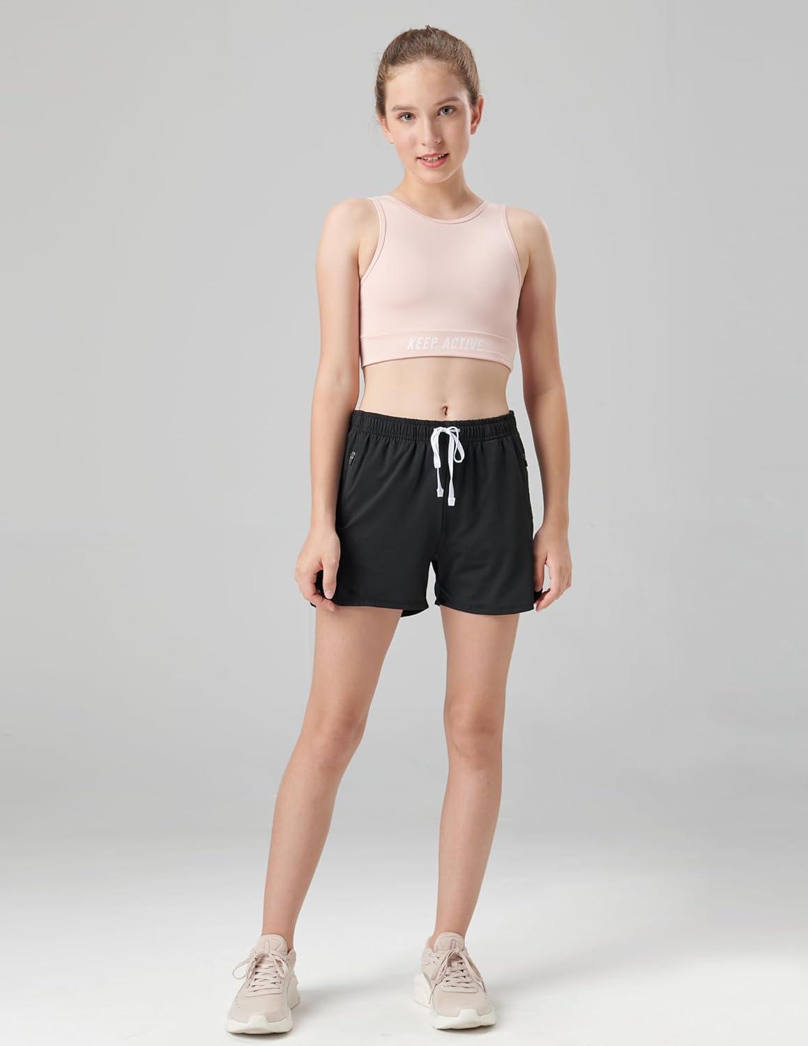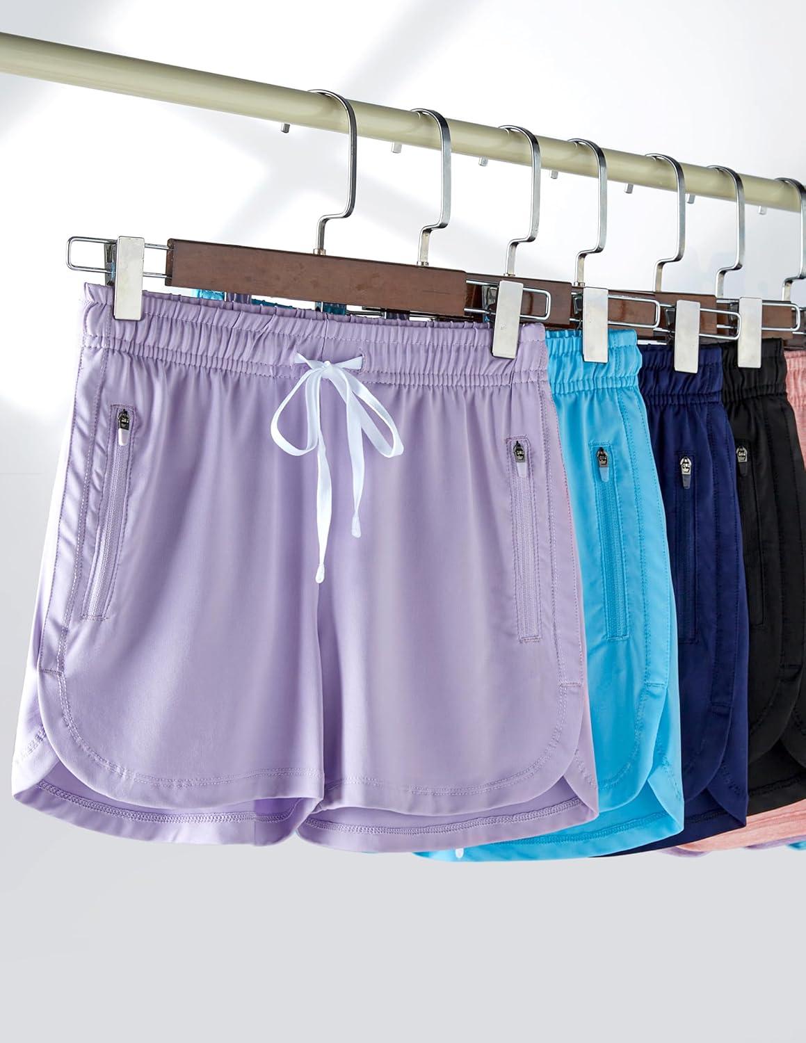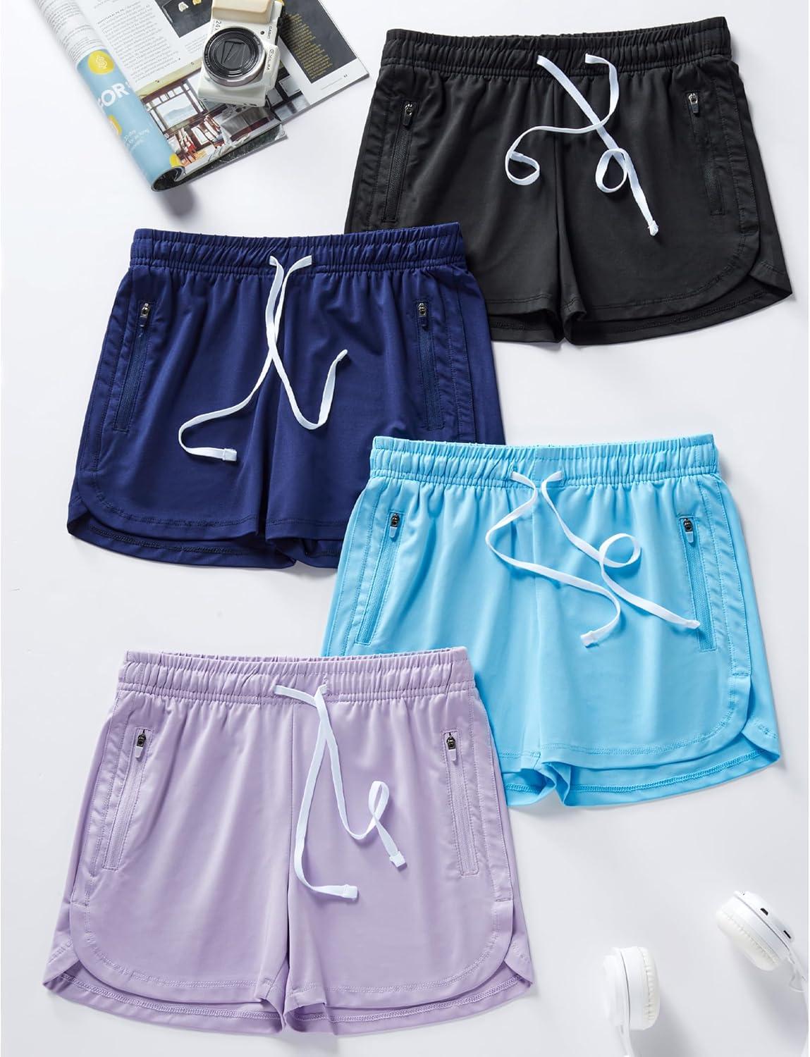 4 Pack Youth Girls Athletic Shorts 3″, Girls Soccer Shorts, Kids Workout Gym Clothes Activewear Apparel with Zipper Pockets(Set 2: Lavender/Baby Blue/Navy/Black)