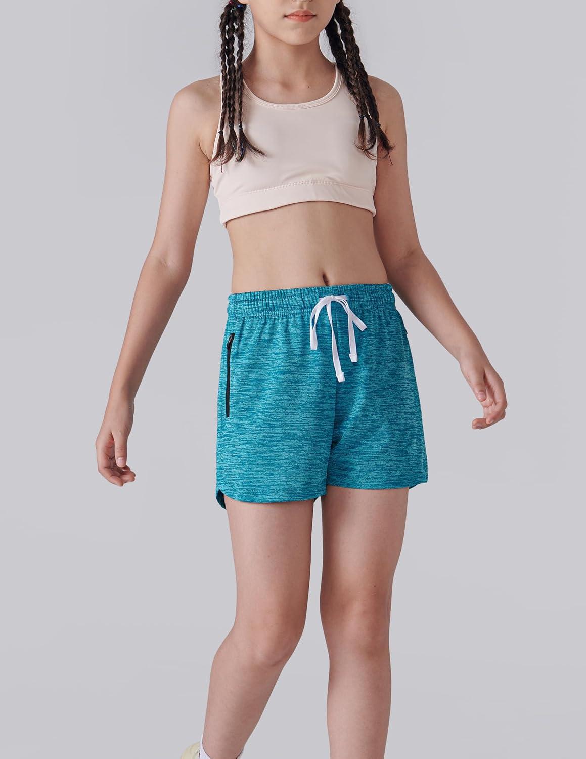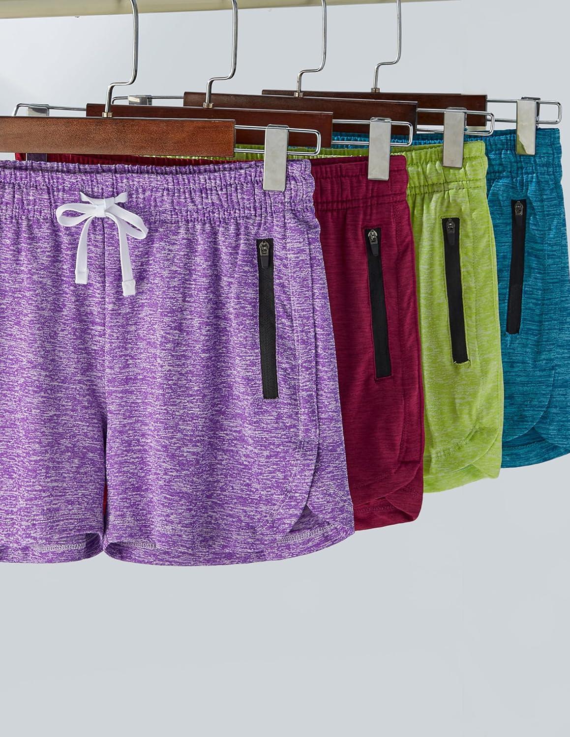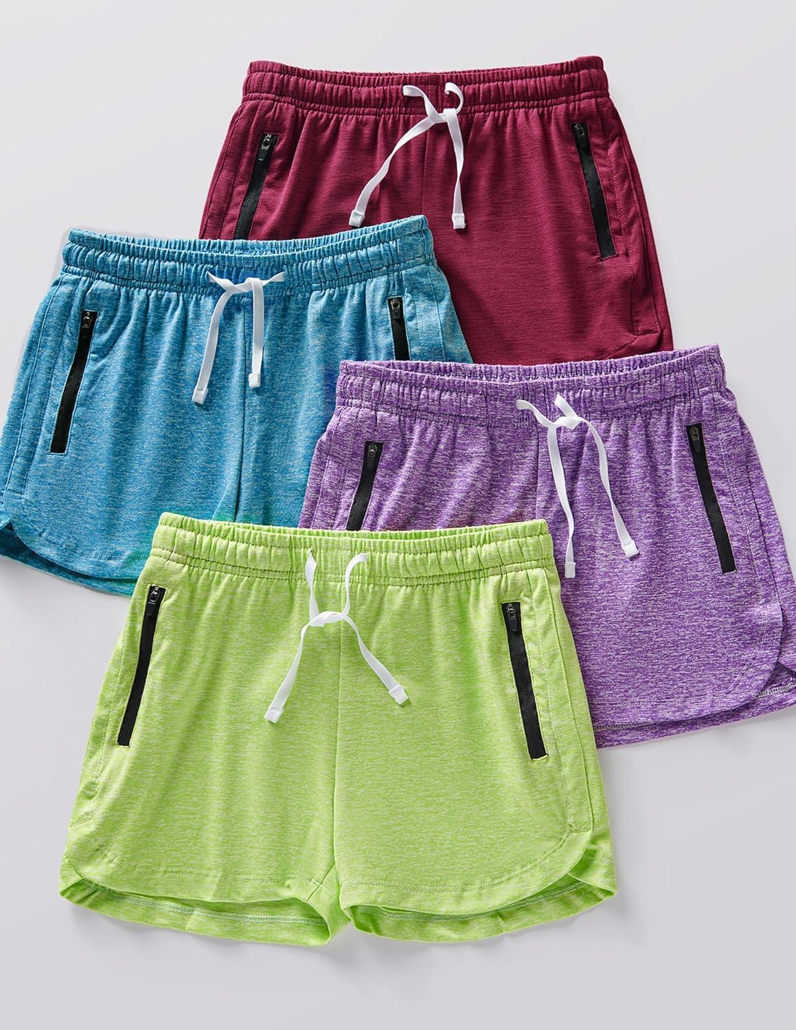 4 Pack Youth Girls Athletic Shorts 3″, Girls Soccer Shorts, Kids Workout Gym Clothes Activewear Apparel with Zipper Pockets(Teal/Cherry/Purple/Neon Yellow)