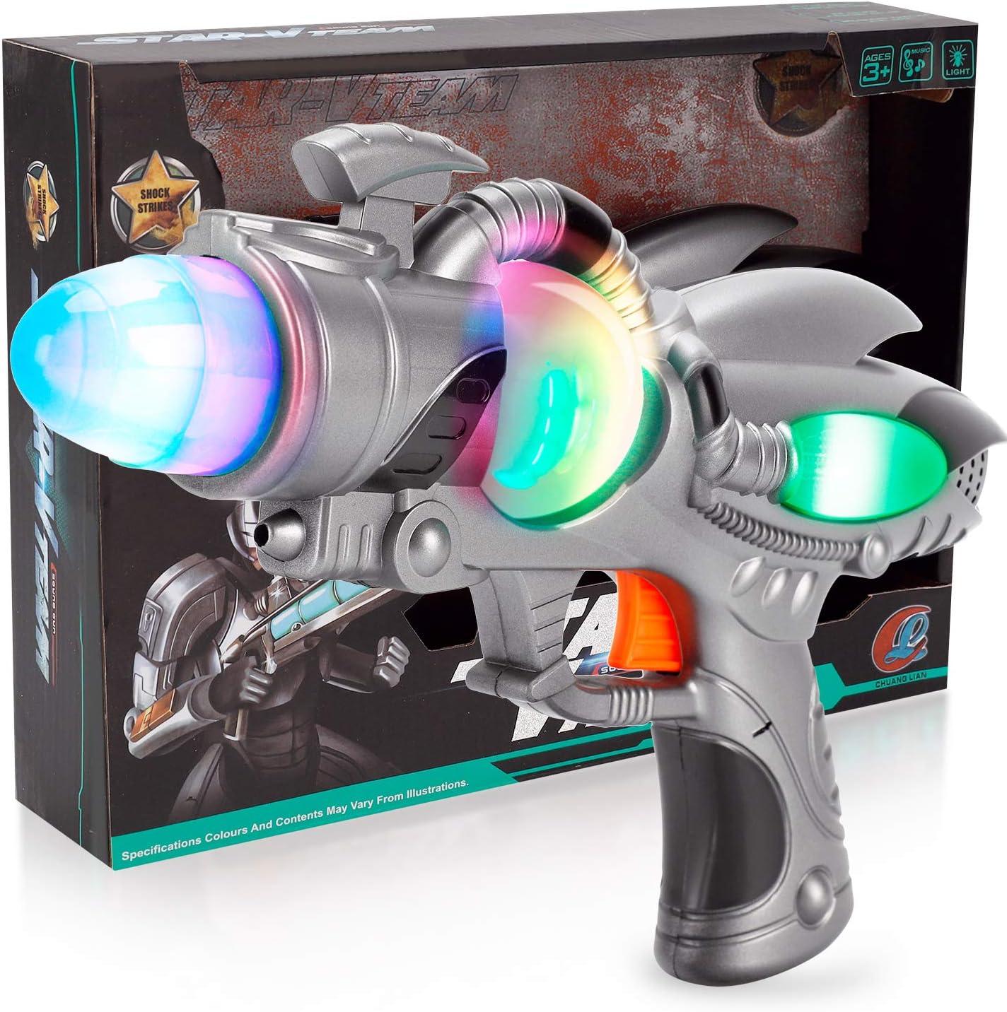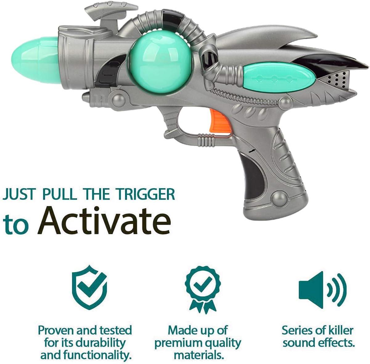Sound and Light Sensation: The dazzling display of lights and blasting sounds will leave kids mesmerized! With colored lights on the sides, top, front, and back with revolving light chambers, this toy gun will provide an out-of-this-world experience.