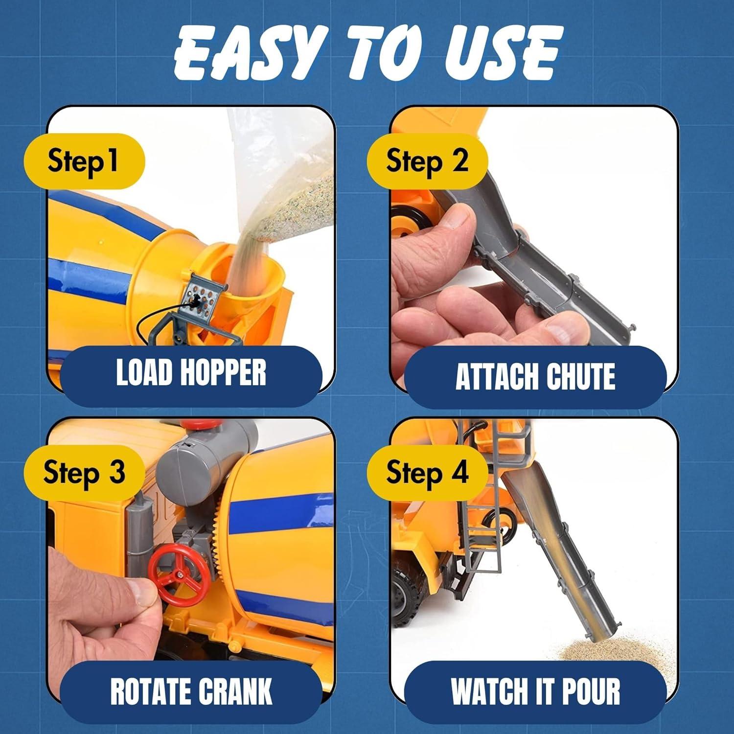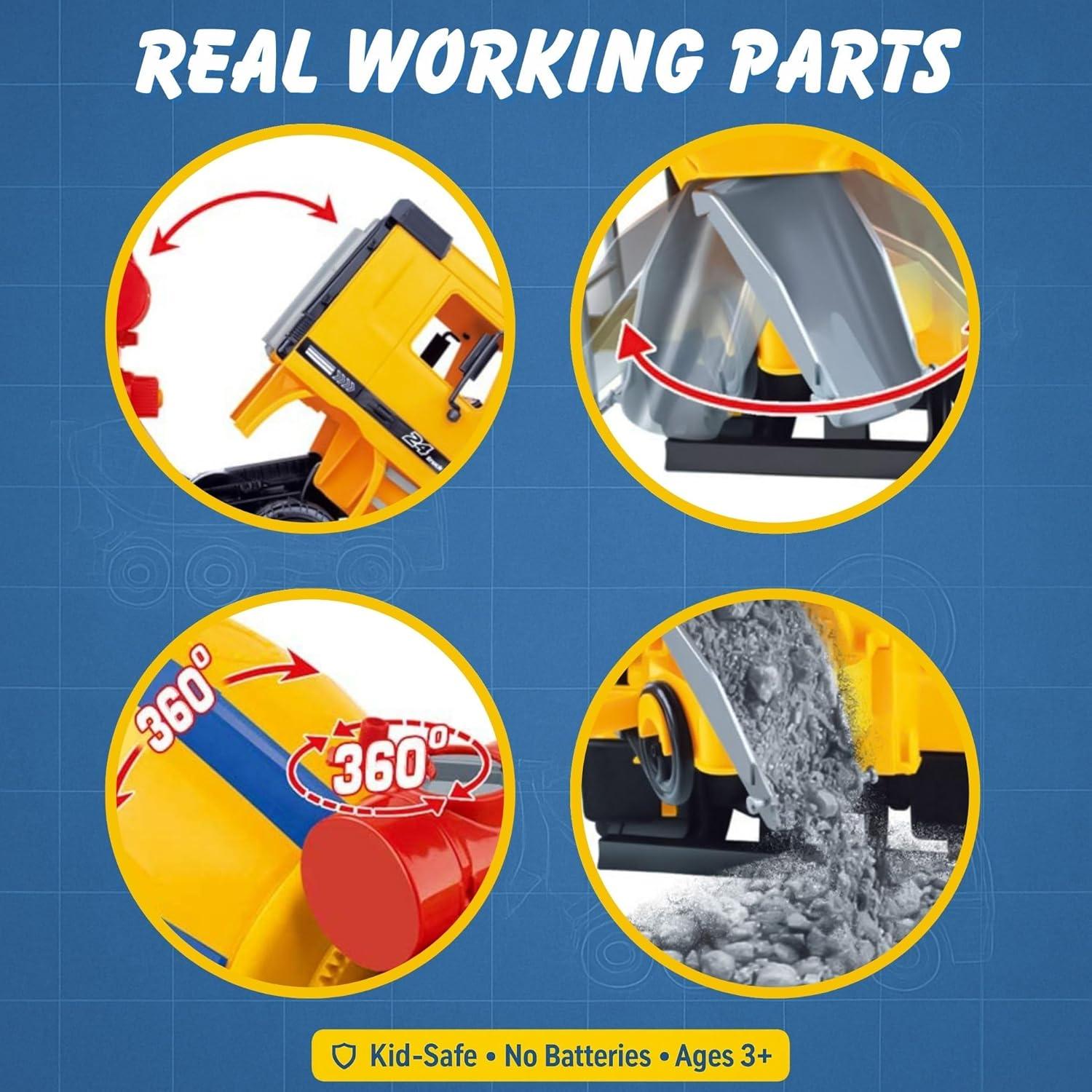 Rotating Drum & Working Chute – Mixing drum spins and rear chute adjusts, just like a real cement truck, encouraging imaginative roleplay and pretend construction projects.