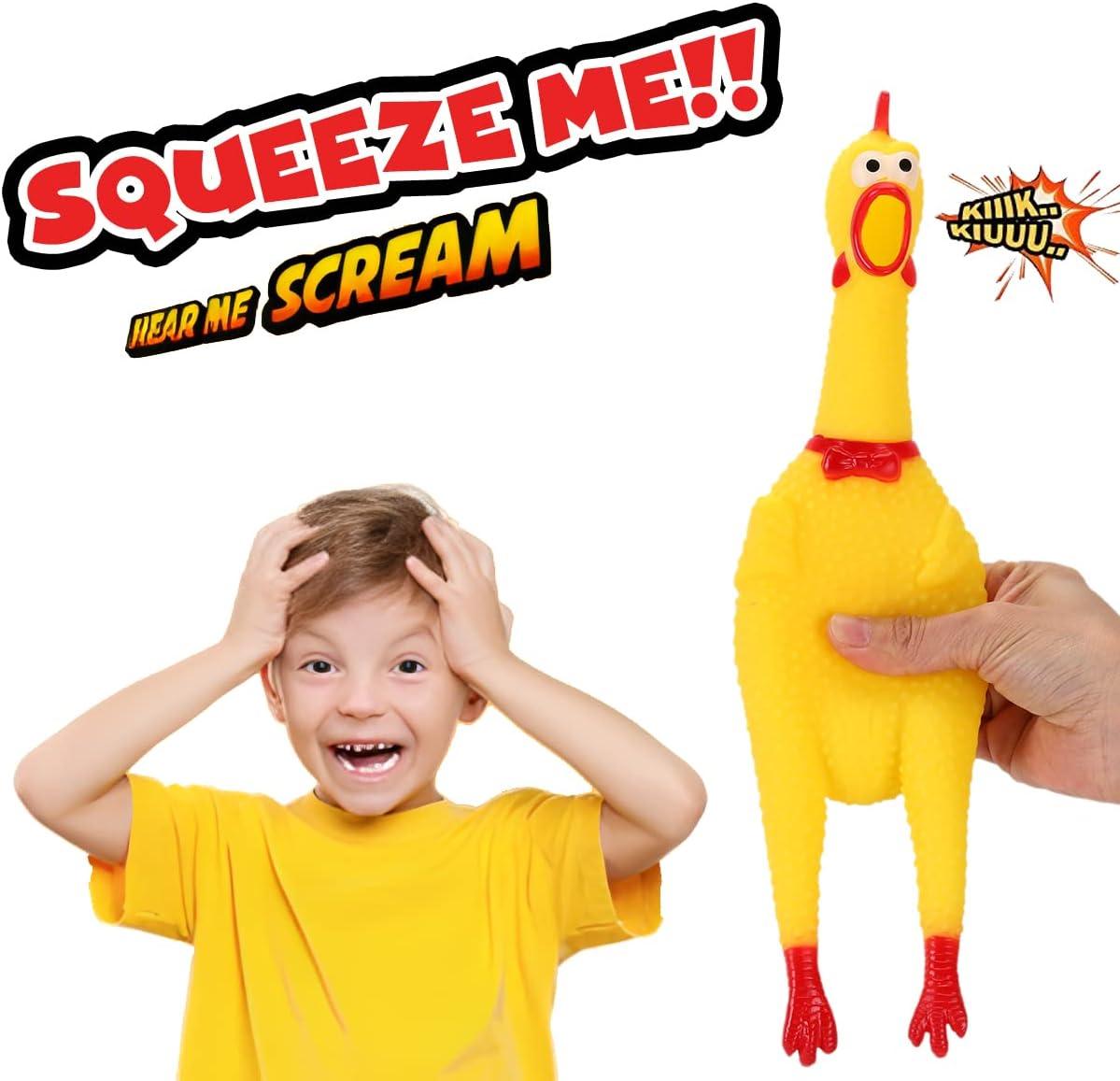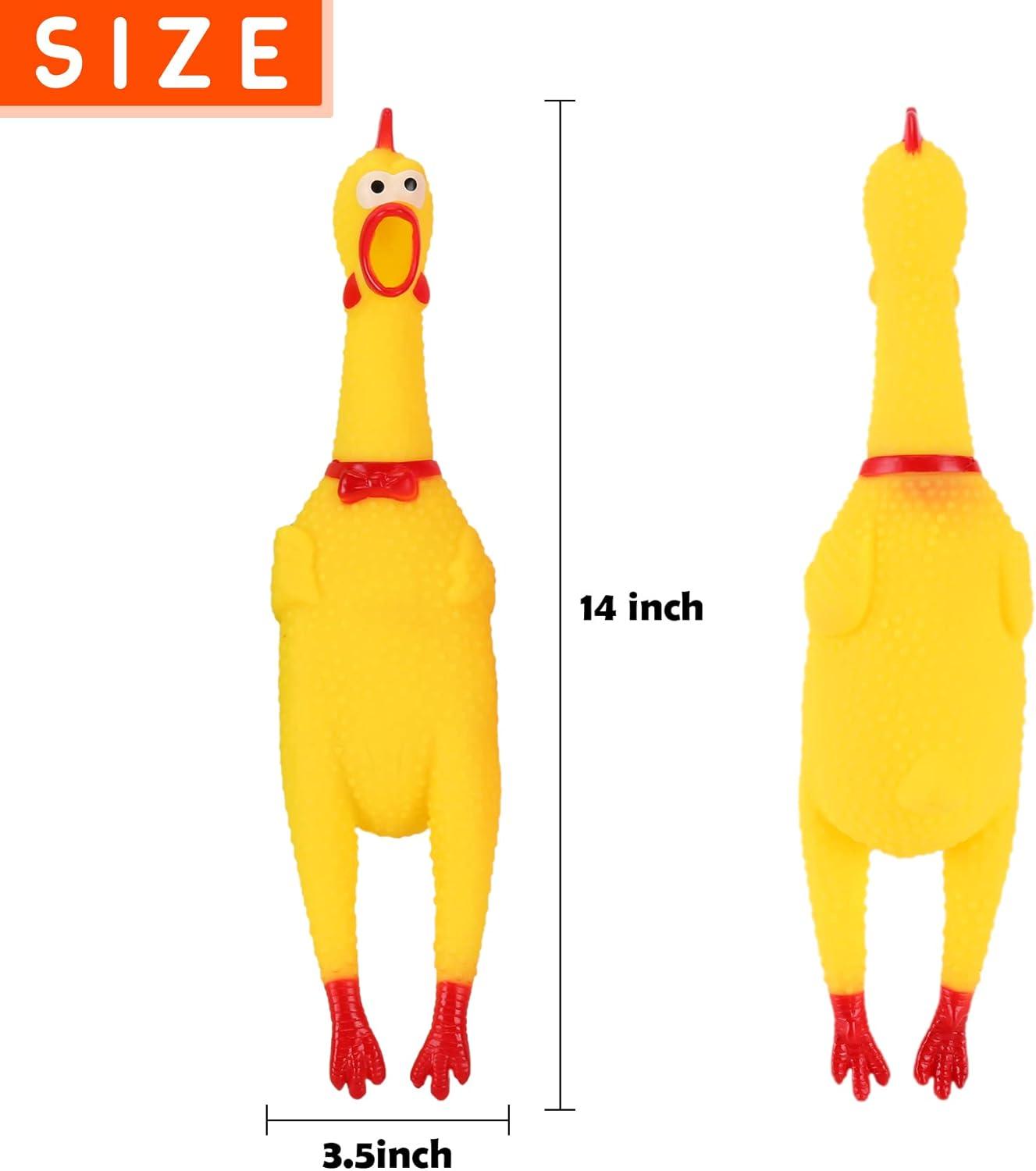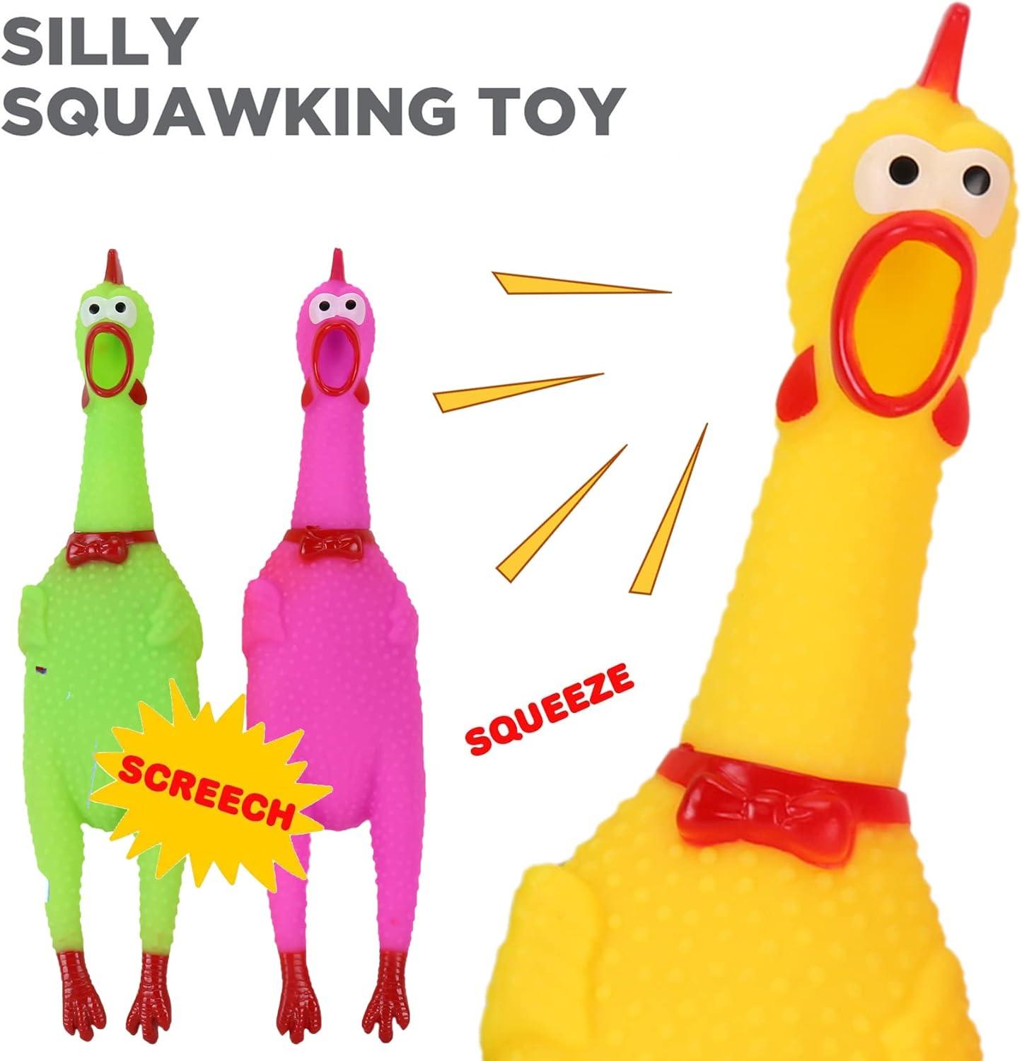 Get ready to bring some noise and laughter to your next family gathering or party with our pack of 3 giant screaming chickens! Available in purple, yellow, and green, these 14-inch rubber chickens are ready to make some noise and add some fun to any occasion. With just a little squeeze, these rubber chickens will shriek with surprise and bring a smile to everyone's face. Constructed of tough, flexible rubber, these toys are designed to take a beating and keep on shrieking. The squawking rubber chickens come with a comical look on their face, ready to make some noise and add some personality to your toy collection. Not only are these giant rubber chickens great for a laugh and a prank, but they also make a perfect stress relief toy. Just give them a good squeeze and hear them squawk away your worries and anxieties. The practical joke rubber chicken is a classic gag that never goes out of style. From the makers of the beloved whoopee cushion, these rubber chickens are the perfect addition to any prankster's arsenal. But they're not just for pranks! These rubber chickens make great toys for kids, adults, cats, and dogs alike. So why not add some fun and laughter to your next party or get-together with our pack of 3 giant screaming chickens? You won't be disappointed!