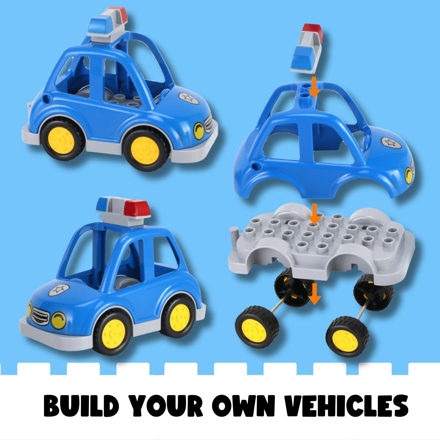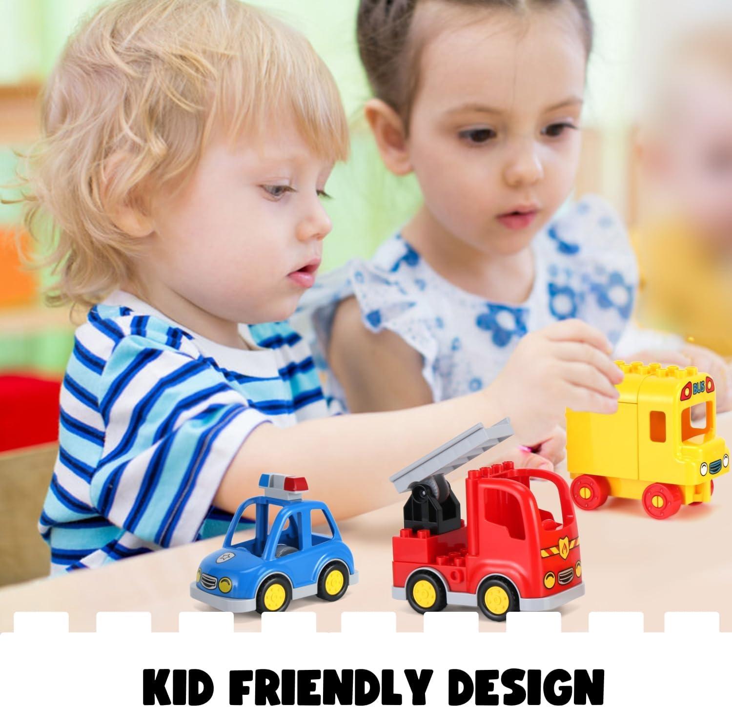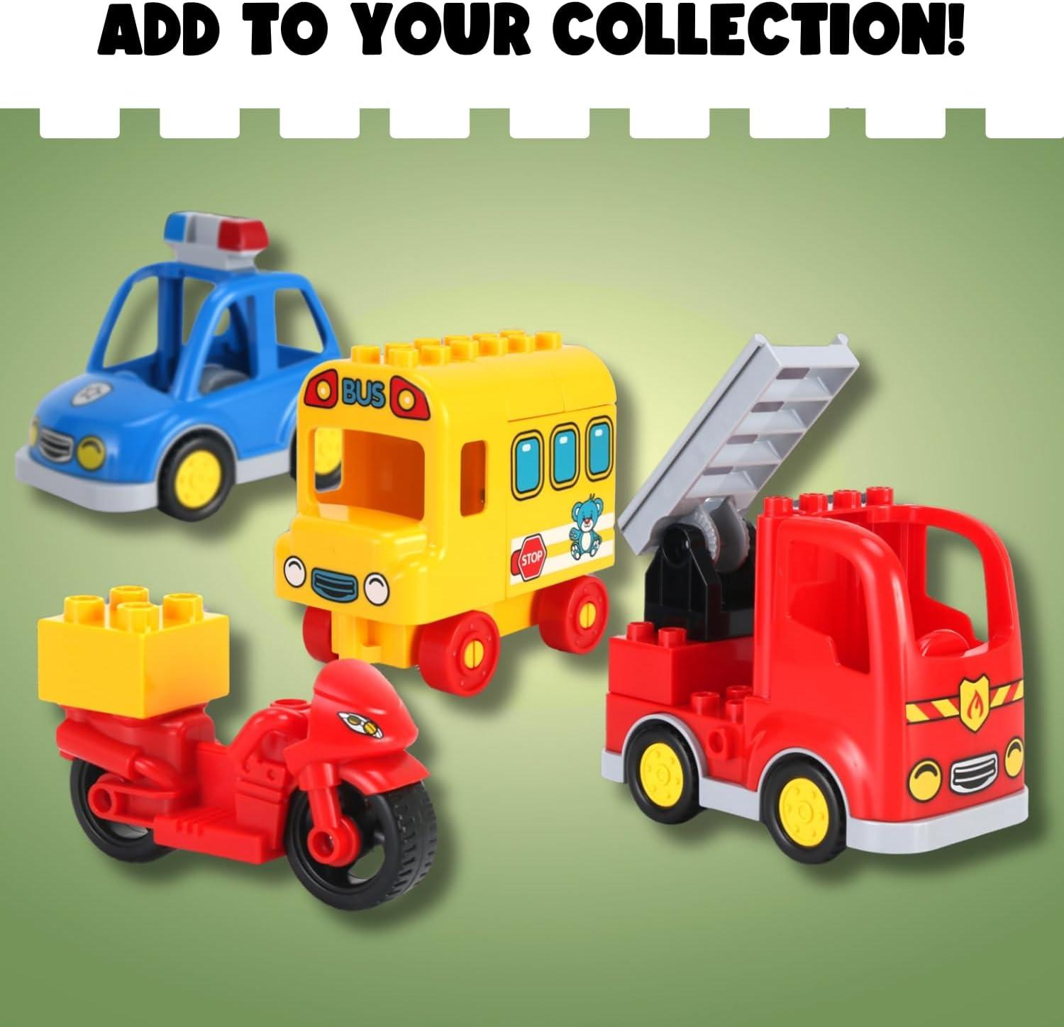 Big Building Blocks: This four-pack Multi Vehicles Set features a police car, fire truck, school bus, and motorcycle, designed to inspire creativity and imaginative play for children aged two to five years