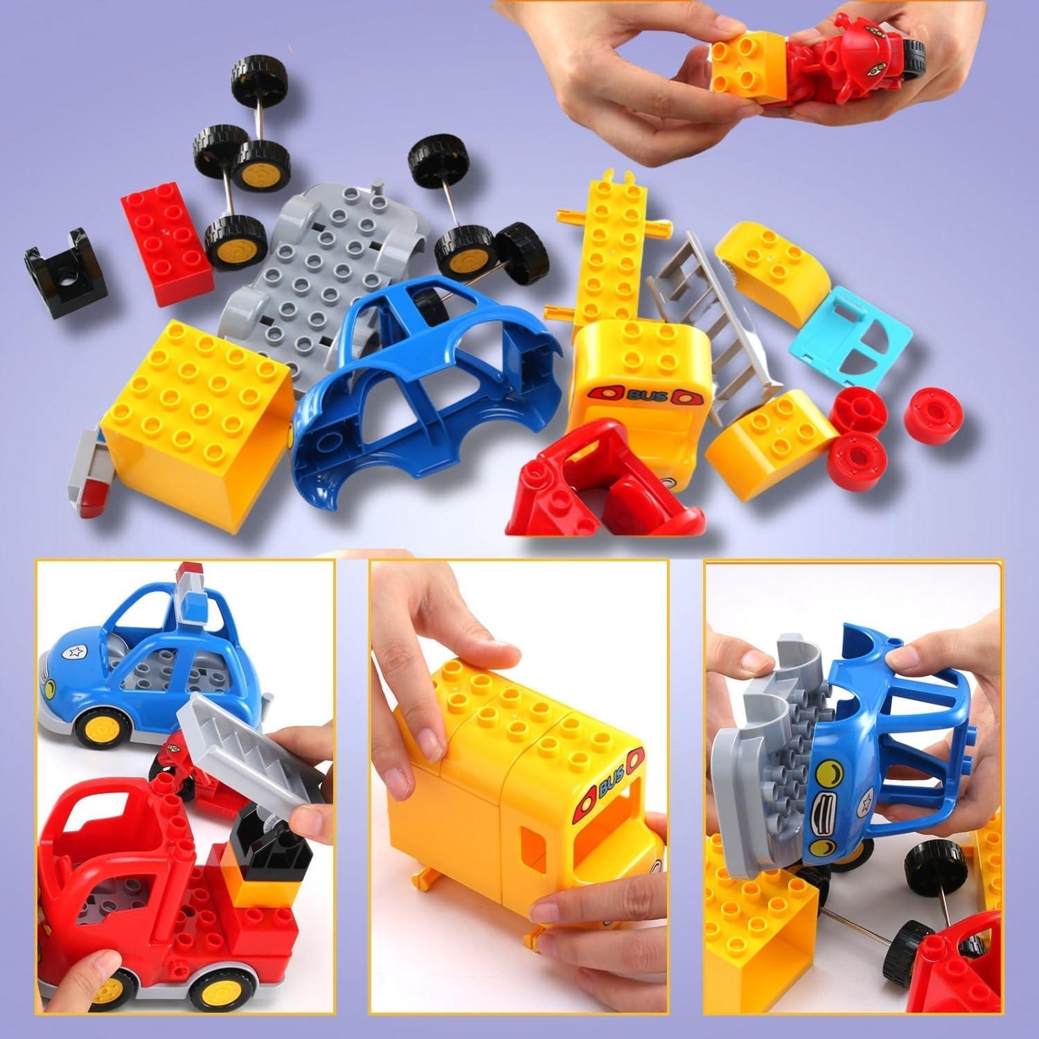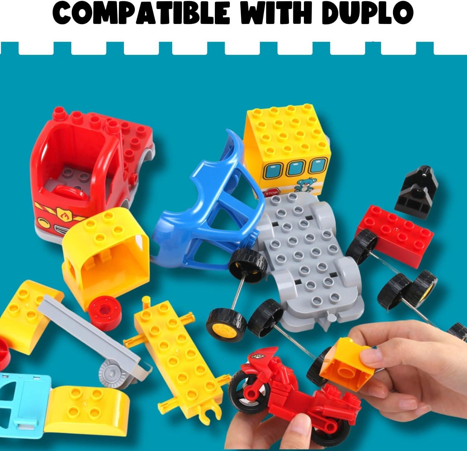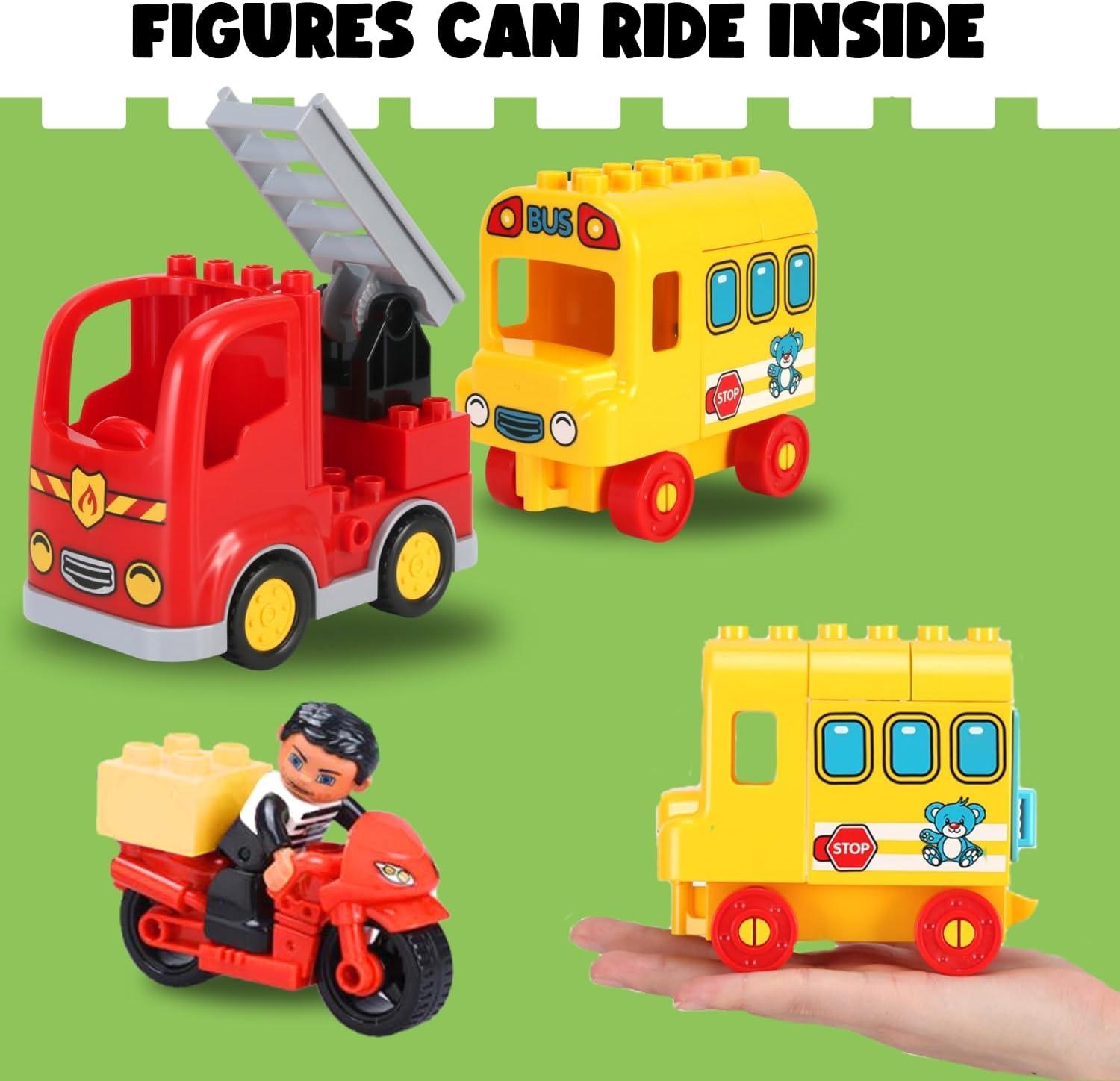 Big Building Blocks: This four-pack Multi Vehicles Set features a police car, fire truck, school bus, and motorcycle, designed to inspire creativity and imaginative play for children aged two to five years