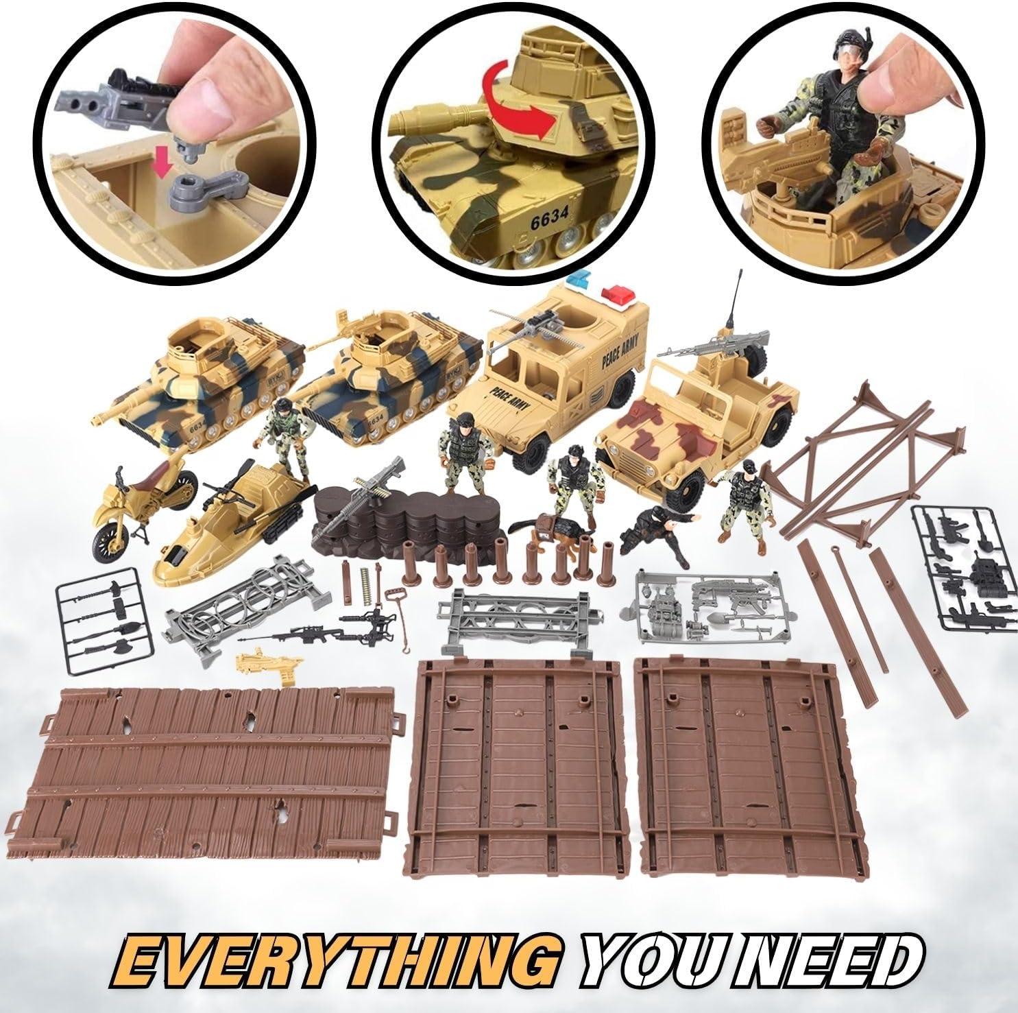 Military Base Toy Set: Command the battlefield with a 42-piece military playset featuring tanks, trucks, a patrol boat, a motorcycle, and an elite squad of action-ready soldiers
