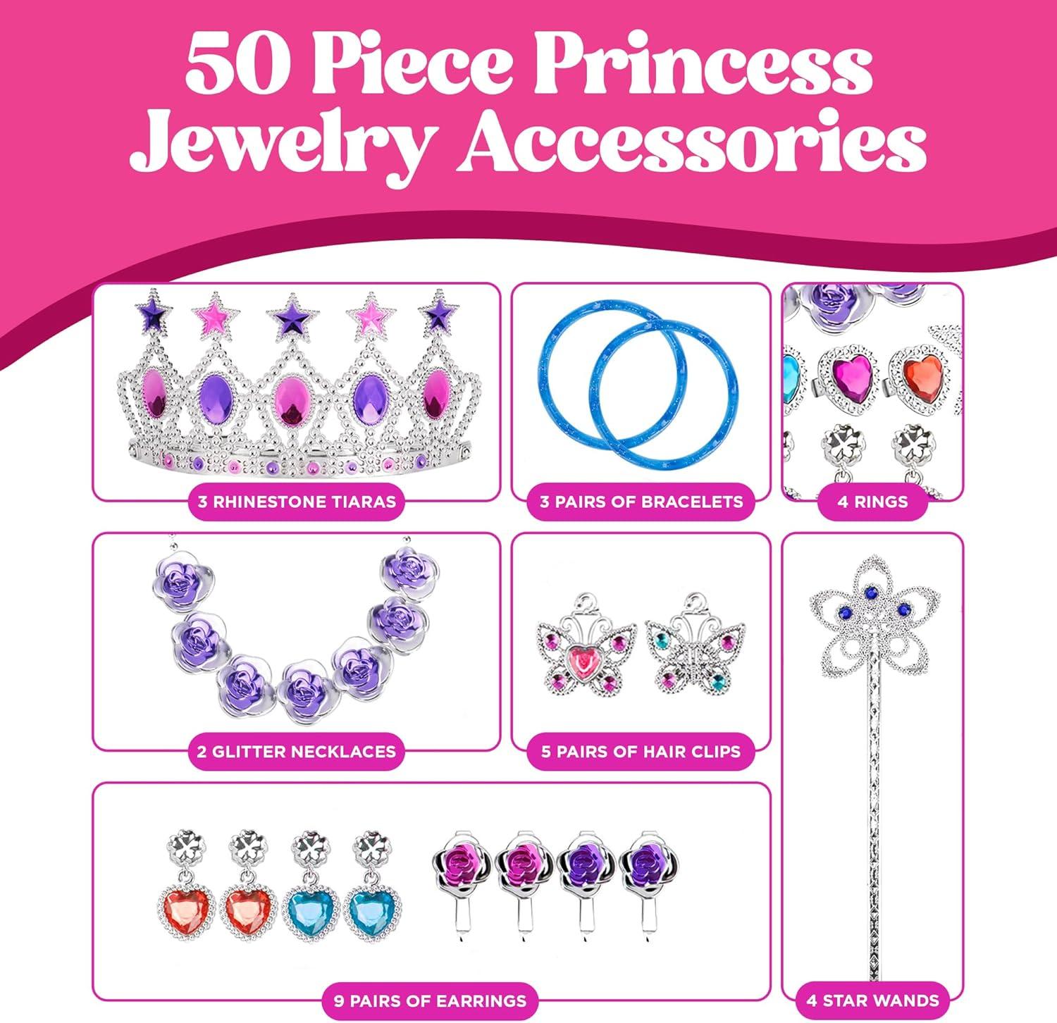 Ultimate Princess Set: Make every day magical with this 50-piece Princess Jewelry Dress-Up Accessories Toy Playset for girls. It’s perfect for transforming any playtime into a royal affair!