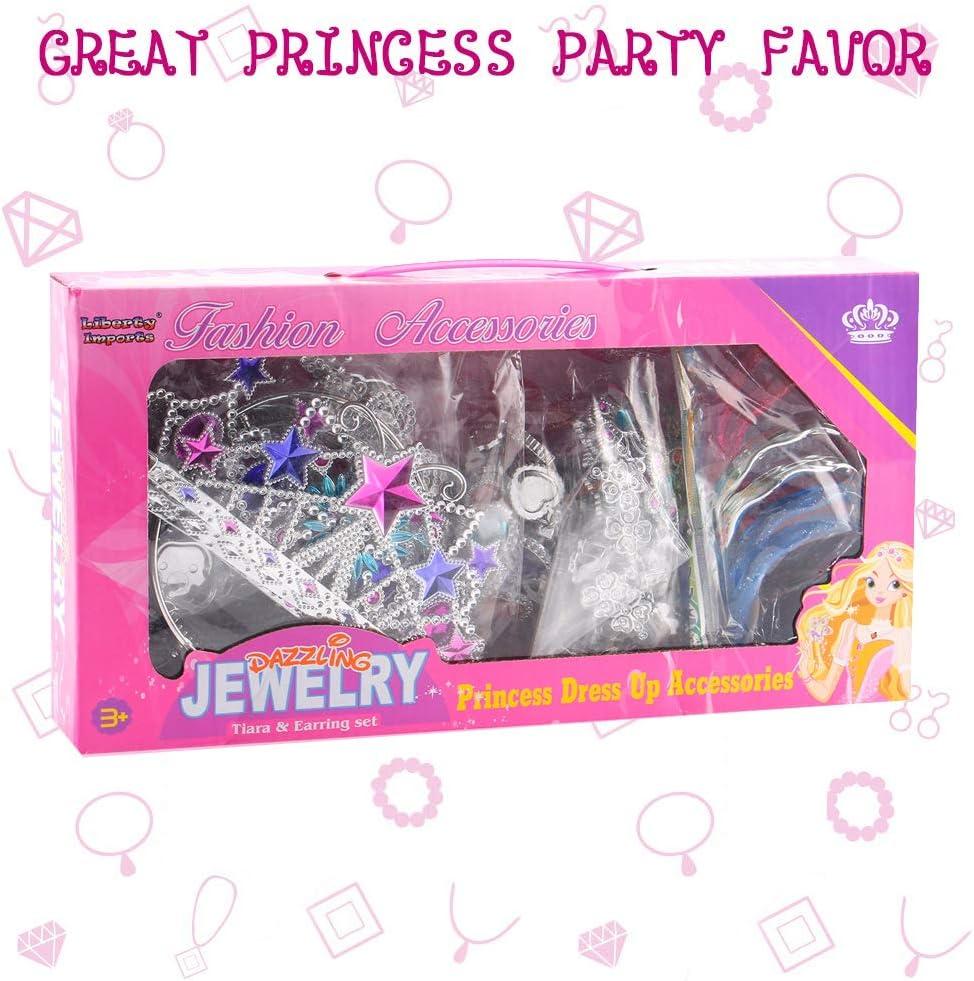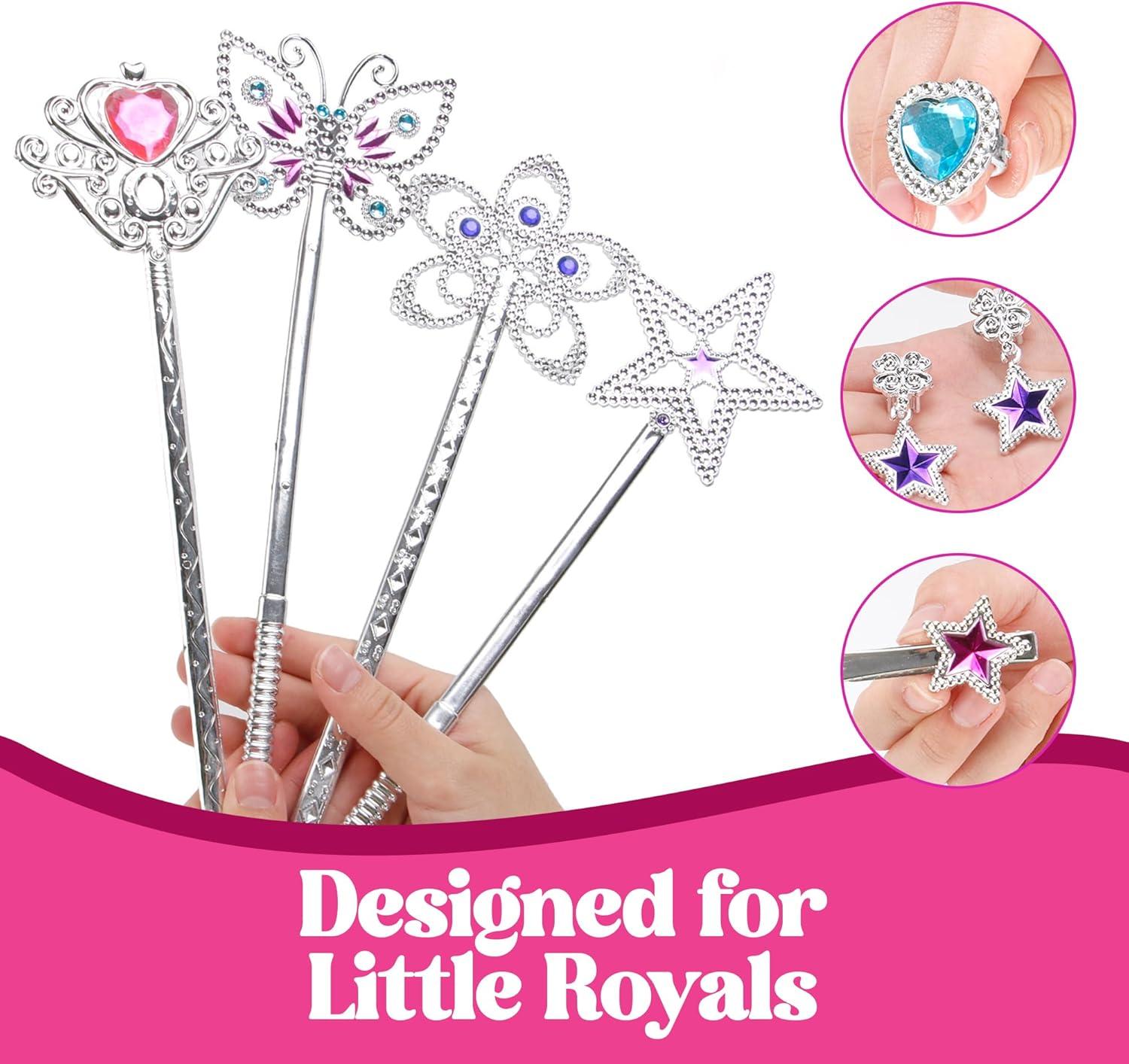 Sparkling Accessories: Featuring three rhinestone tiaras, two glitter necklaces, four rings, four star wands, three pairs of bracelets, nine pairs of earrings, and five pairs of hair snap clips, your little one will shine like the princess she is!