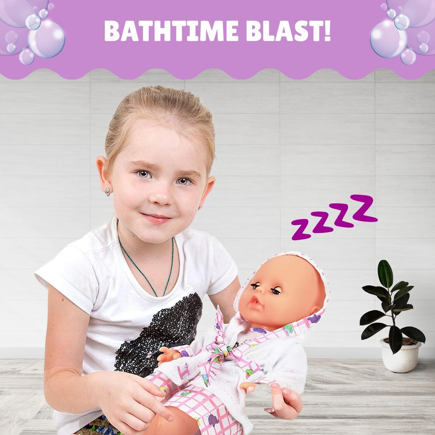 Interactive play: Includes a pink loofah sponge, rubber duck, pretend lotion, shampoo, soap, bathrobe, and baby clothes to encourage imaginative and interactive play