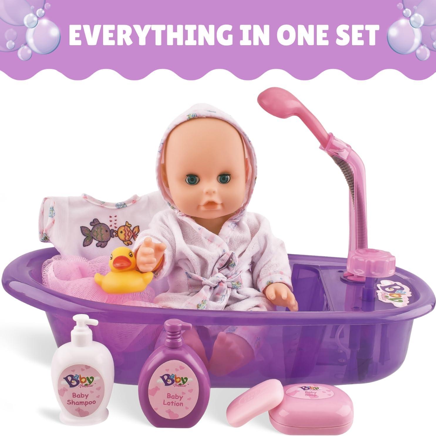 Realistic bath time fun: Let your child experience the joy of bath time with this adorable baby doll playset featuring a 13-inch realistic vinyl doll and a purple bathtub with a detachable shower spray and many accessories