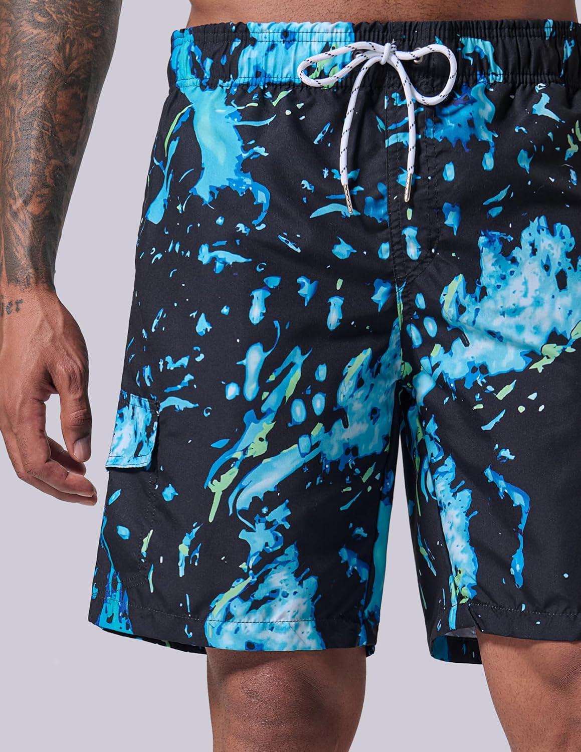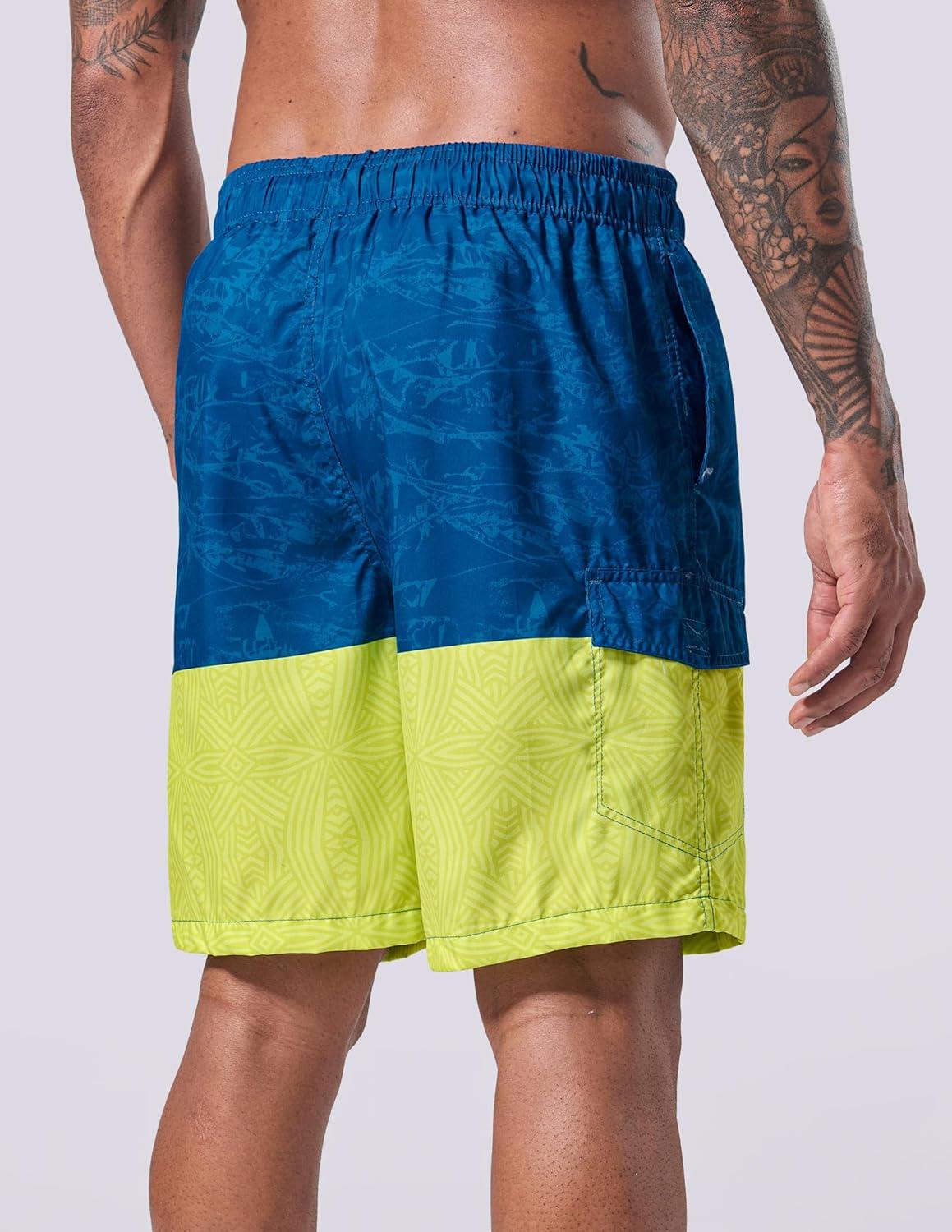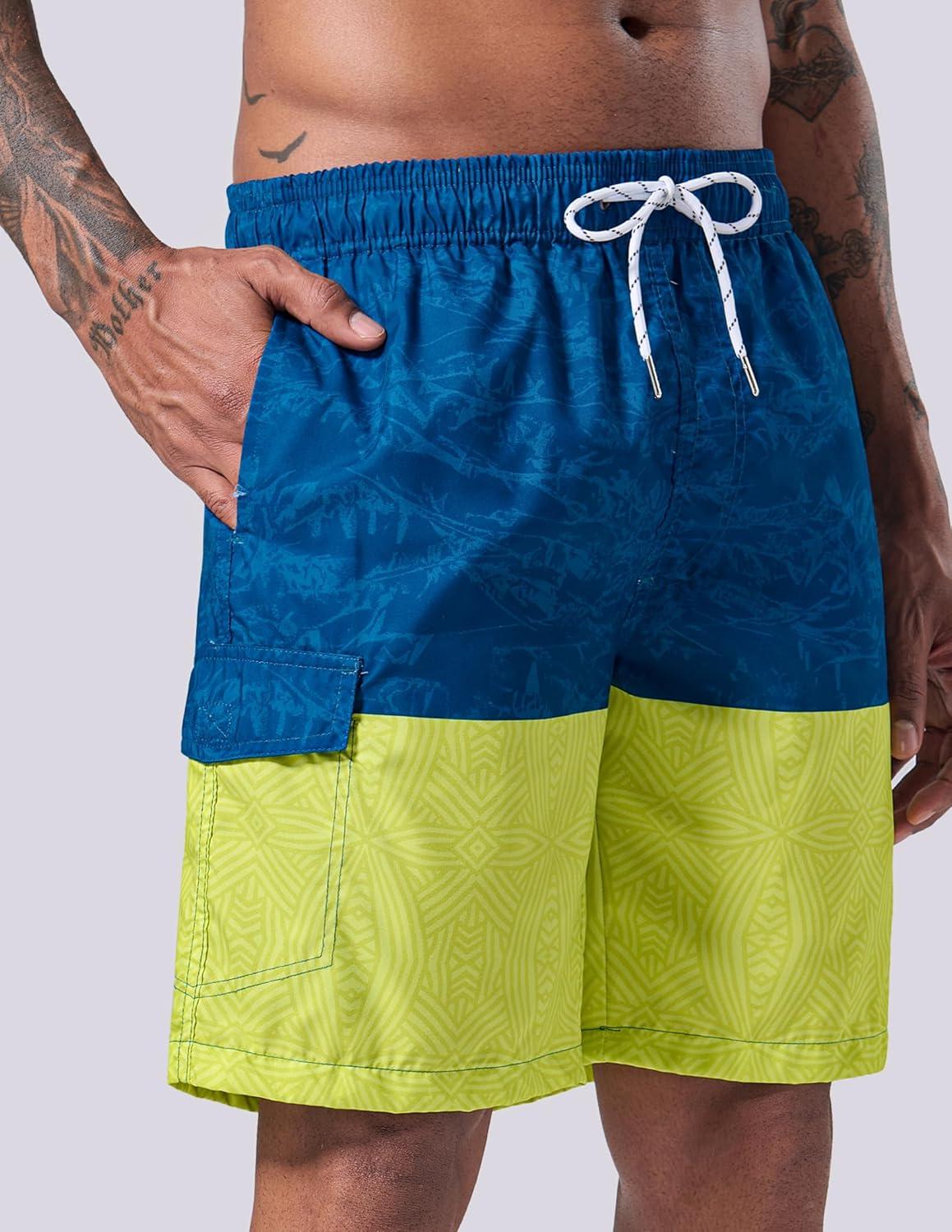 Men’s 9″ Quick Dry Swim Trunks with Mesh Lining and Cargo Pockets, Beach Shorts Bathing Suits(Geo Contrast / Neon Splash)