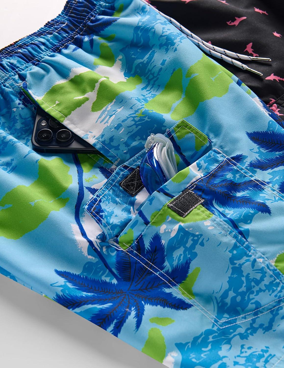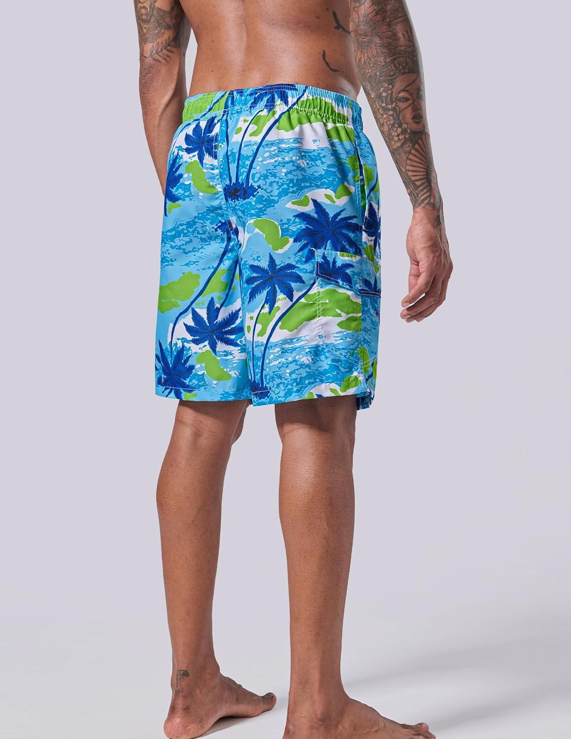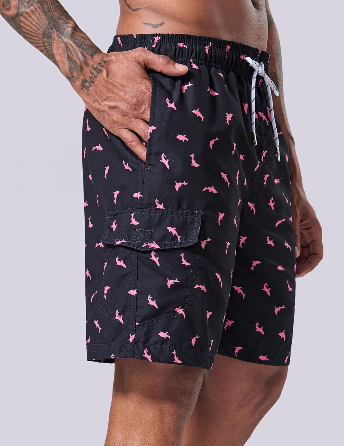 Men’s 9″ Quick Dry Swim Trunks with Mesh Lining and Cargo Pockets, Beach Shorts Bathing Suits(Shark Pattern / Palm Trees)